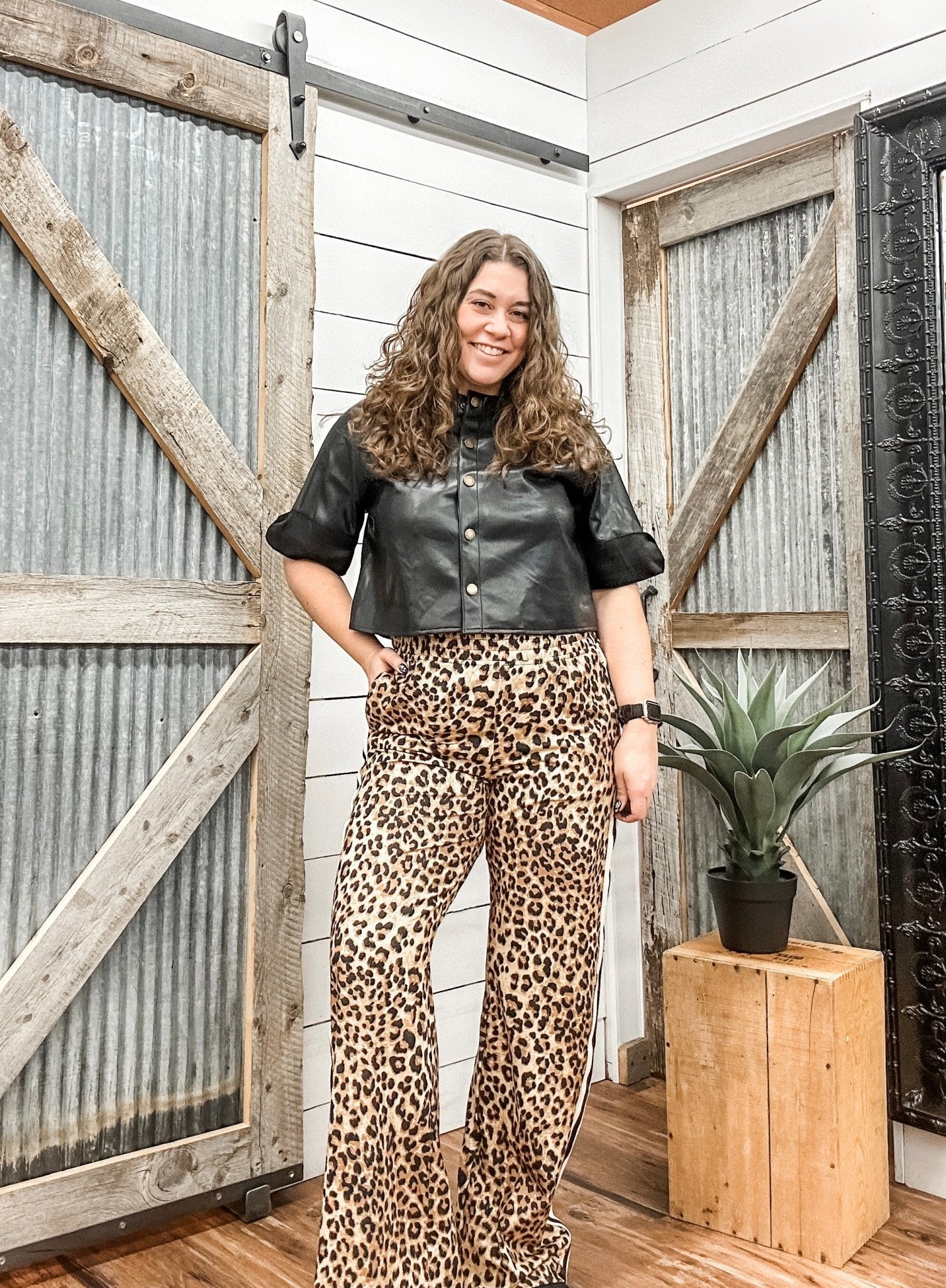 Looking for statement pants that are just as comfortable as they are cool? These leopard print track pants blend sporty ease with bold style. The high-rise fit and relaxed straight leg make them easy to wear all day, while the leopard print and side stripe detailing add an elevated, fashion-forward edge.