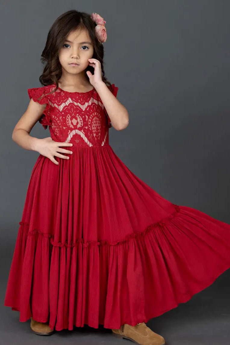 Elegant and vintage-inspired, the Girls Macy Dress is a full-tiered maxi dress designed to delight. Featuring an embellished lace panel at the front and fluttering lace sleeves, this dress combines classic charm with graceful movement. Fully lined for comfort and finished with a center back invisible zipper, it’s perfect for special occasions.