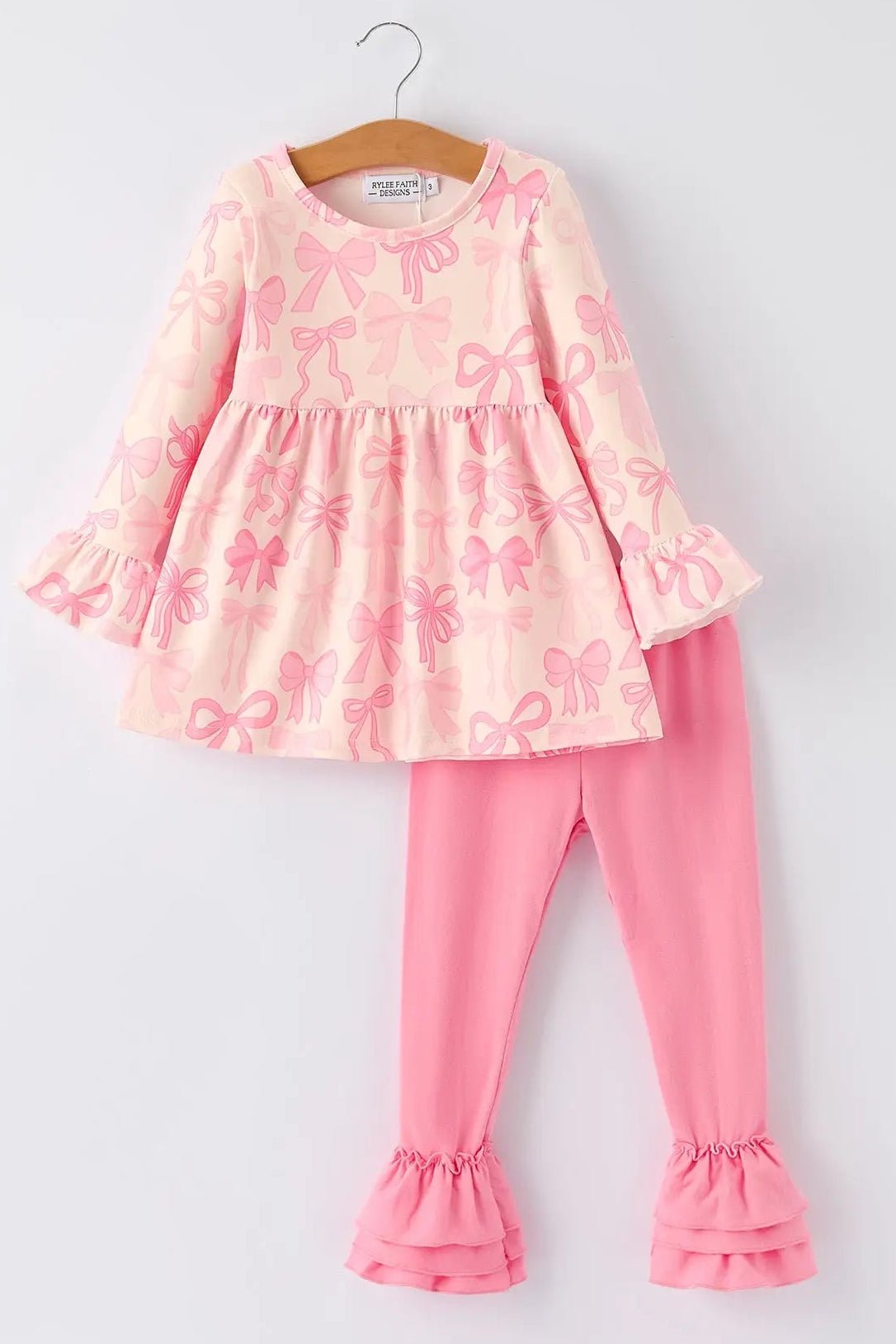 Girls Pink Bow Print Ruffled Long Sleeve Set