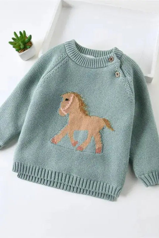 Looking for a cozy, playful sweater that keeps her warm while looking adorable? The Gwenny Horse Sweater features a whimsical light brown horse motif with a soft pink bridle and two brown buttons on the left side, perfect for layering or wearing on chilly days.