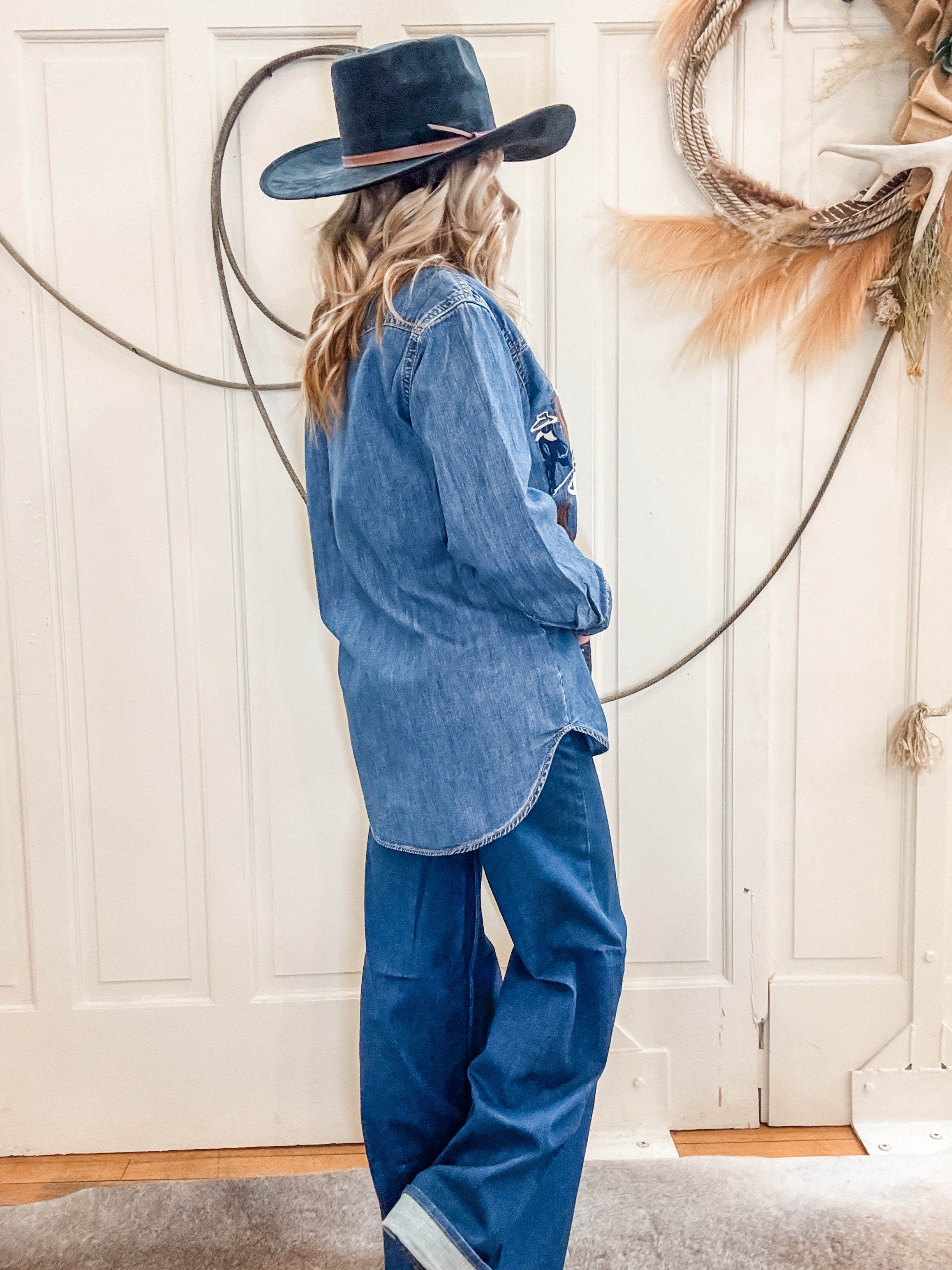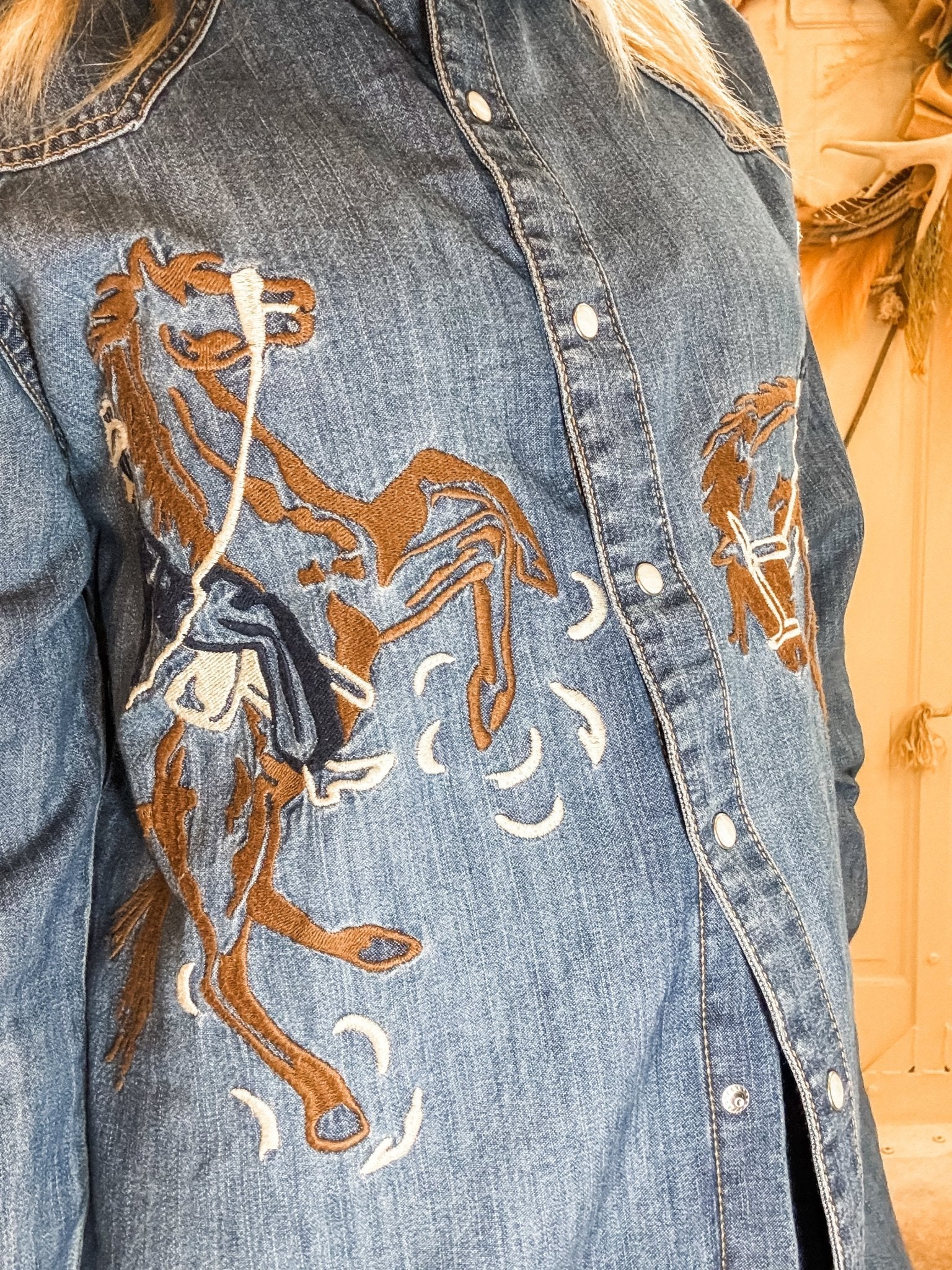 Denim Boyfriend Embroidered Snap Shirt – Medium Wash