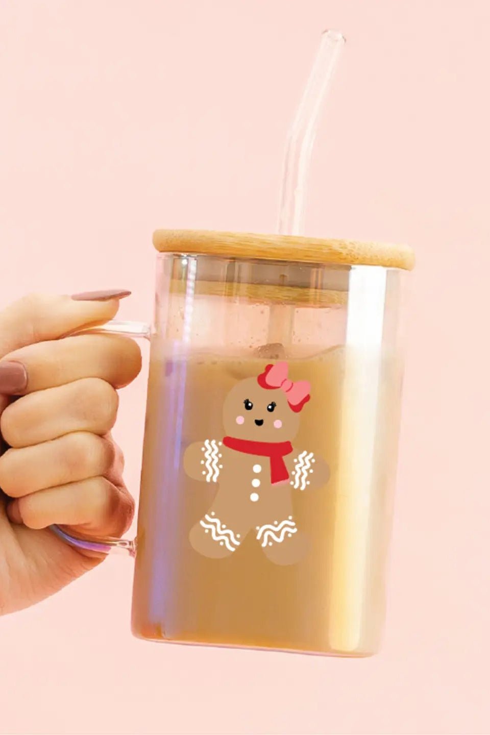 Add festive cheer to your drinkware with the Square Glass Cup – Gingerbread Girl. Crafted from iridescent glass in a modern square shape, it features a charming gingerbread graphic, a comfortable handle, and comes complete with a bamboo lid and glass straw for eco-friendly sipping.