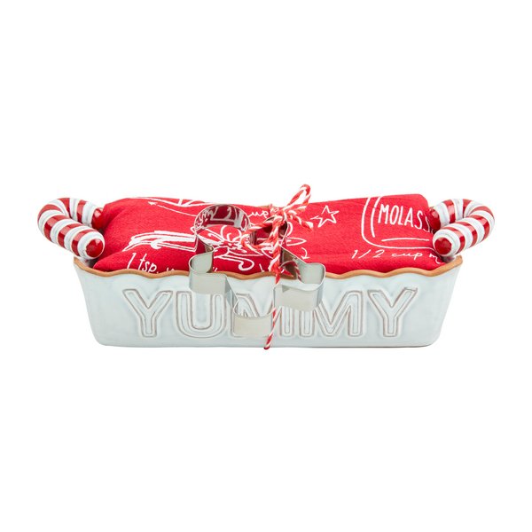 - 3-piece collection includes a hand-painted terracotta loaf pan, a soft cotton hand towel, and a stainless steel cookie cutter
