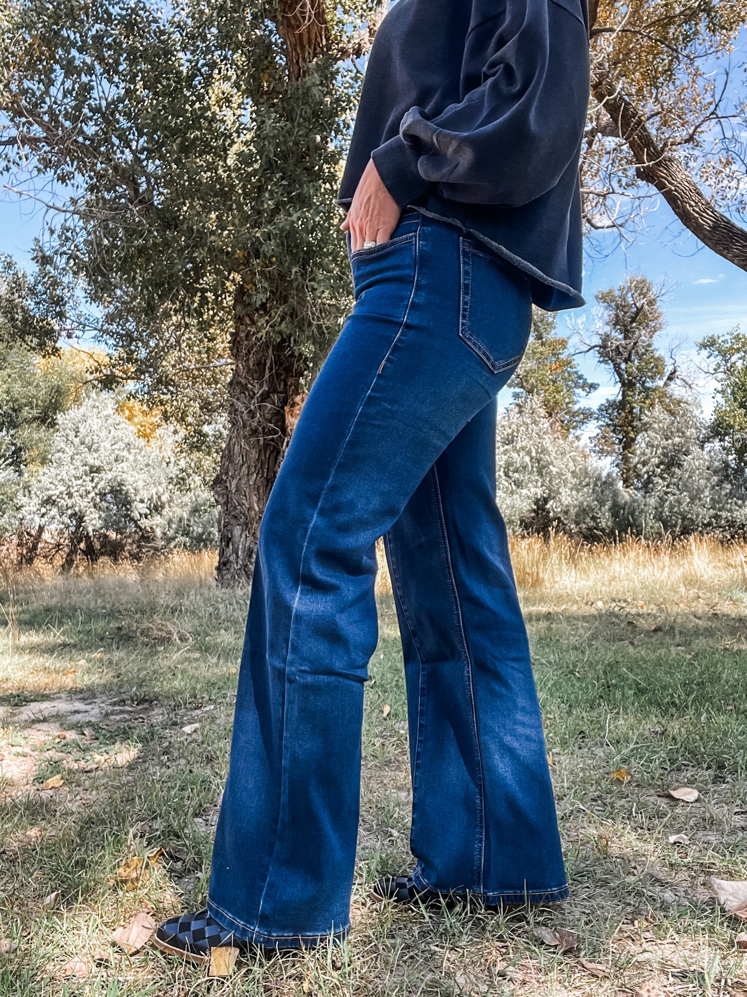 Give your denim rotation a modern upgrade with these high-rise flare jeans, designed with a slim fit through the hips and thighs before breaking into a flattering flare. Crafted in a dark wash with subtle front seam detailing, they’re equal parts versatile and stylish. A touch of stretch ensures comfort while keeping the silhouette structured, making them your go-to for everyday wear or dressed-up occasions.