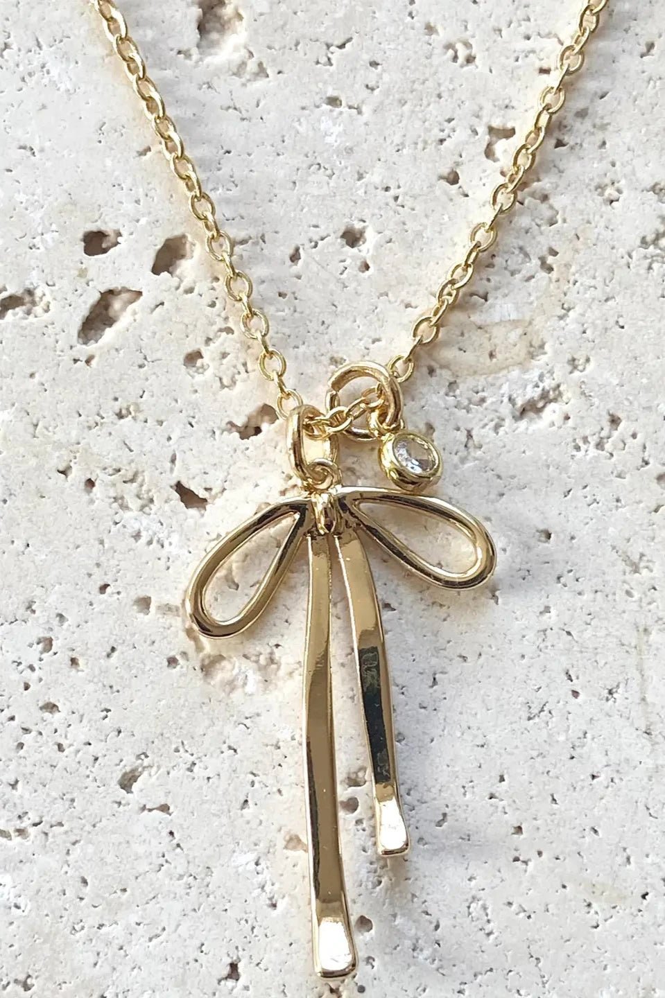 This gold trendy ribbon bow necklace is a must have right now wear it by itself or layer it up! it features a cute, tiny, bonus, clear crystal charm, 18 inches