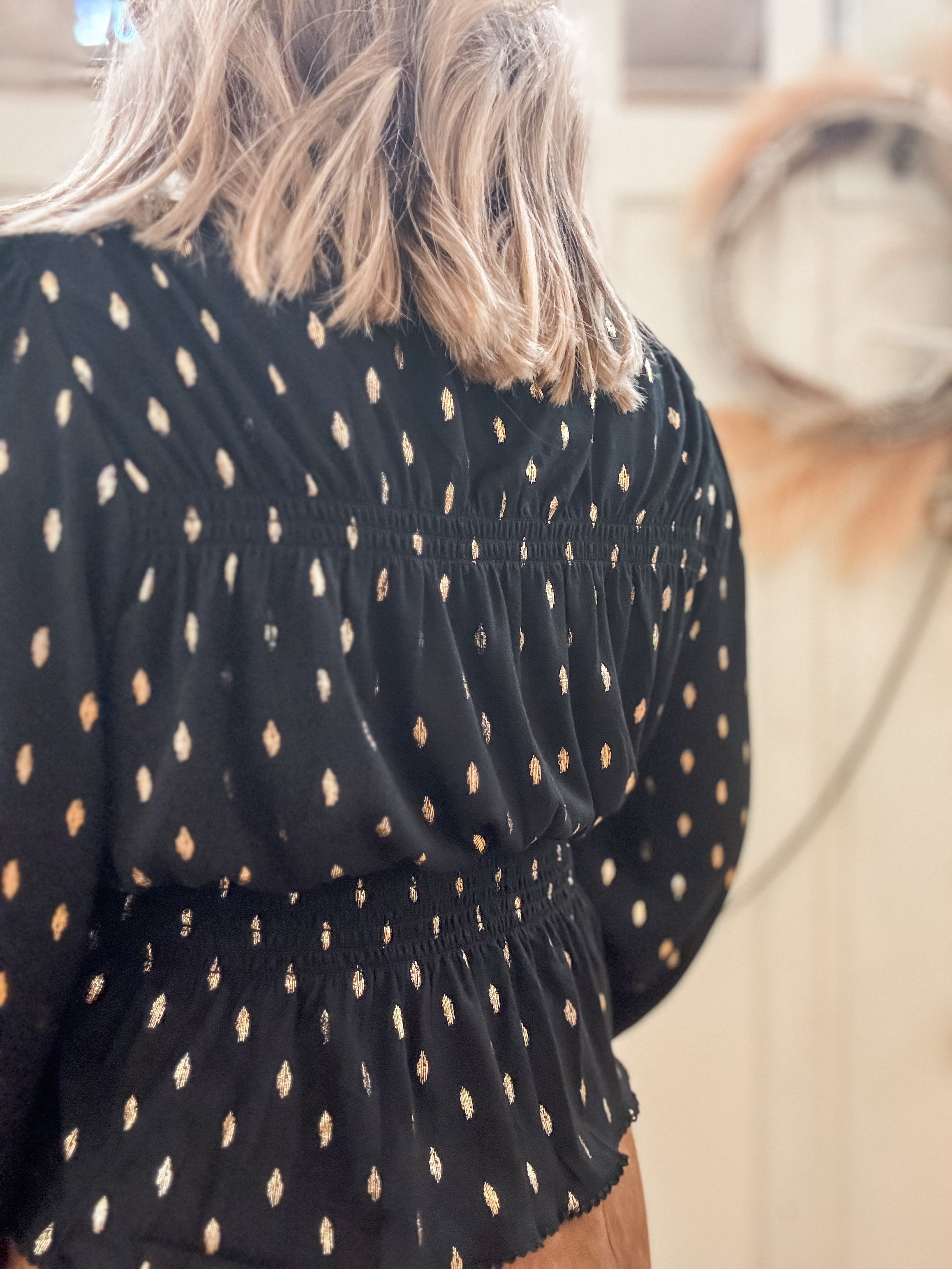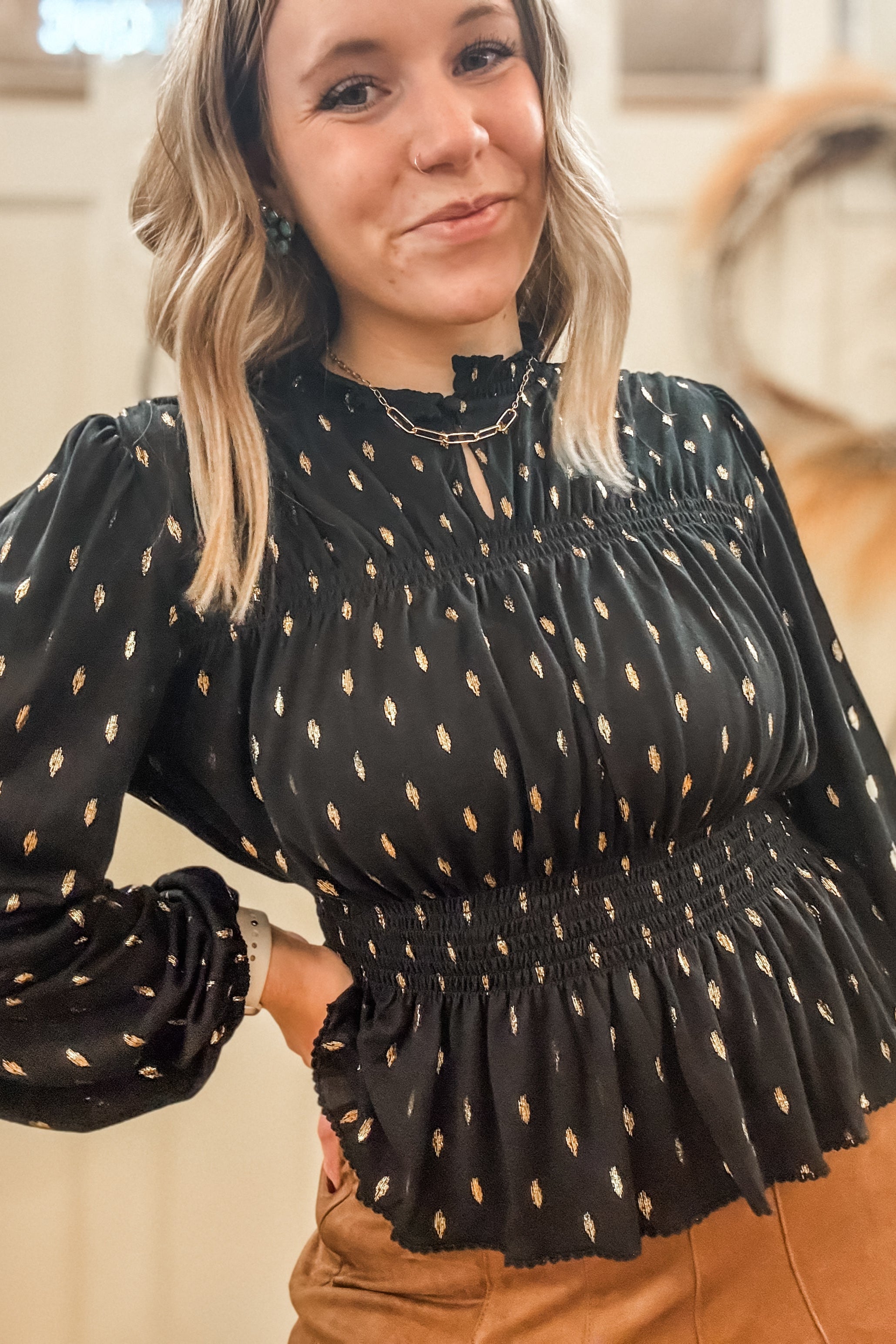 Looking for a blouse that’s equal parts sophisticated and statement-making? This black and gold peplum blouse delivers effortless elegance with every wear. Designed with subtle metallic gold accents that shimmer beautifully under the light, it features a flattering smocked waist and ruffled neckline for a feminine finish. Perfect for work, dinner dates, or holiday gatherings — it’s the kind of top that instantly elevates your look.