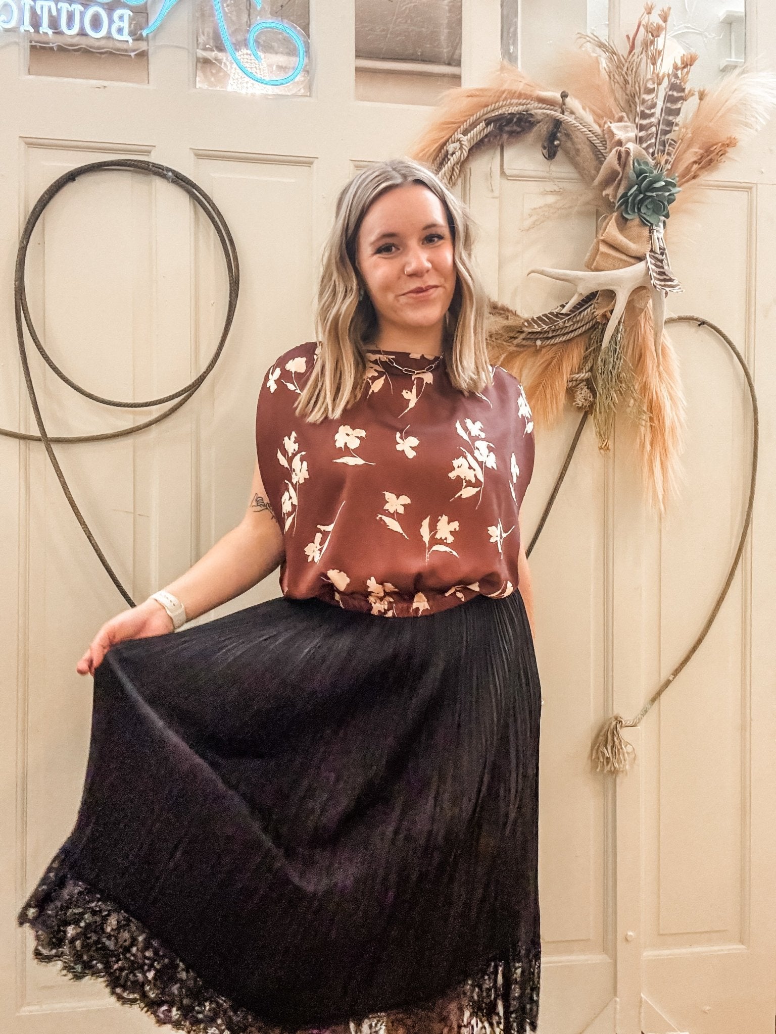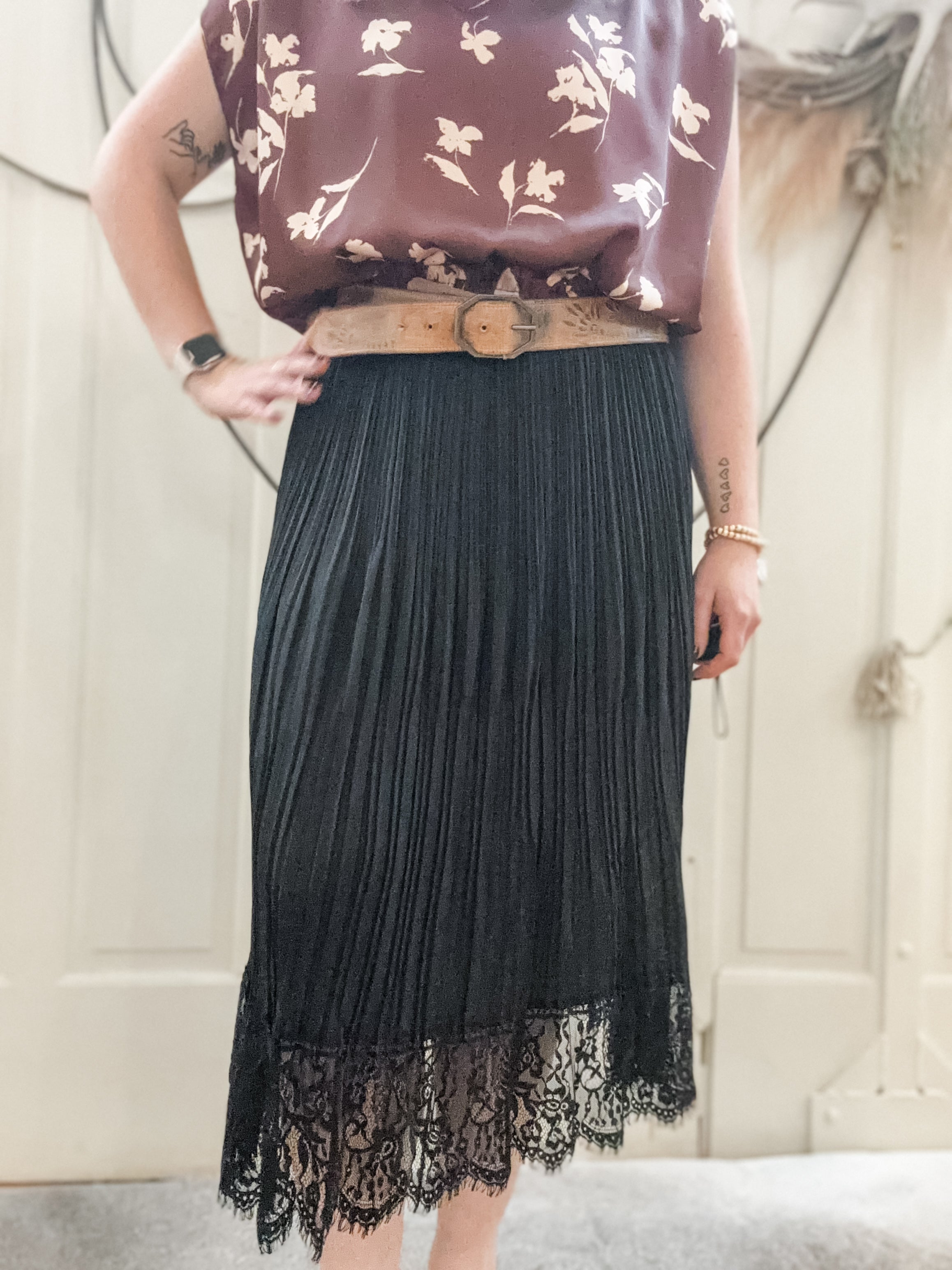 Refined, romantic, and endlessly versatile. Looking for a lace slip skirt that moves beautifully and feels effortless from day to night? This black pleated midi skirt is your new go-to. Designed with a soft satin waistband and elegant pleats that sway as you walk, it flatters every figure while the scalloped floral lace hem adds just the right touch of allure.