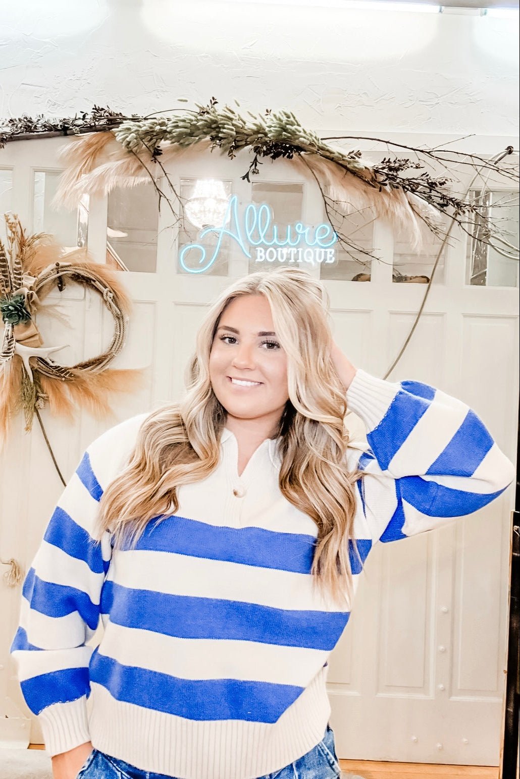 Channel effortless collegiate charm with the Blue Striped Varsity Sweater, designed for both comfort and timeless style. Featuring a polo collar with a two-button placket, this relaxed-fit sweater offers an easy, laid-back silhouette that’s perfect for layering. The horizontal stripe pattern brings a bold yet classic touch, making it a versatile piece that transitions seamlessly from casual weekends to polished outings.