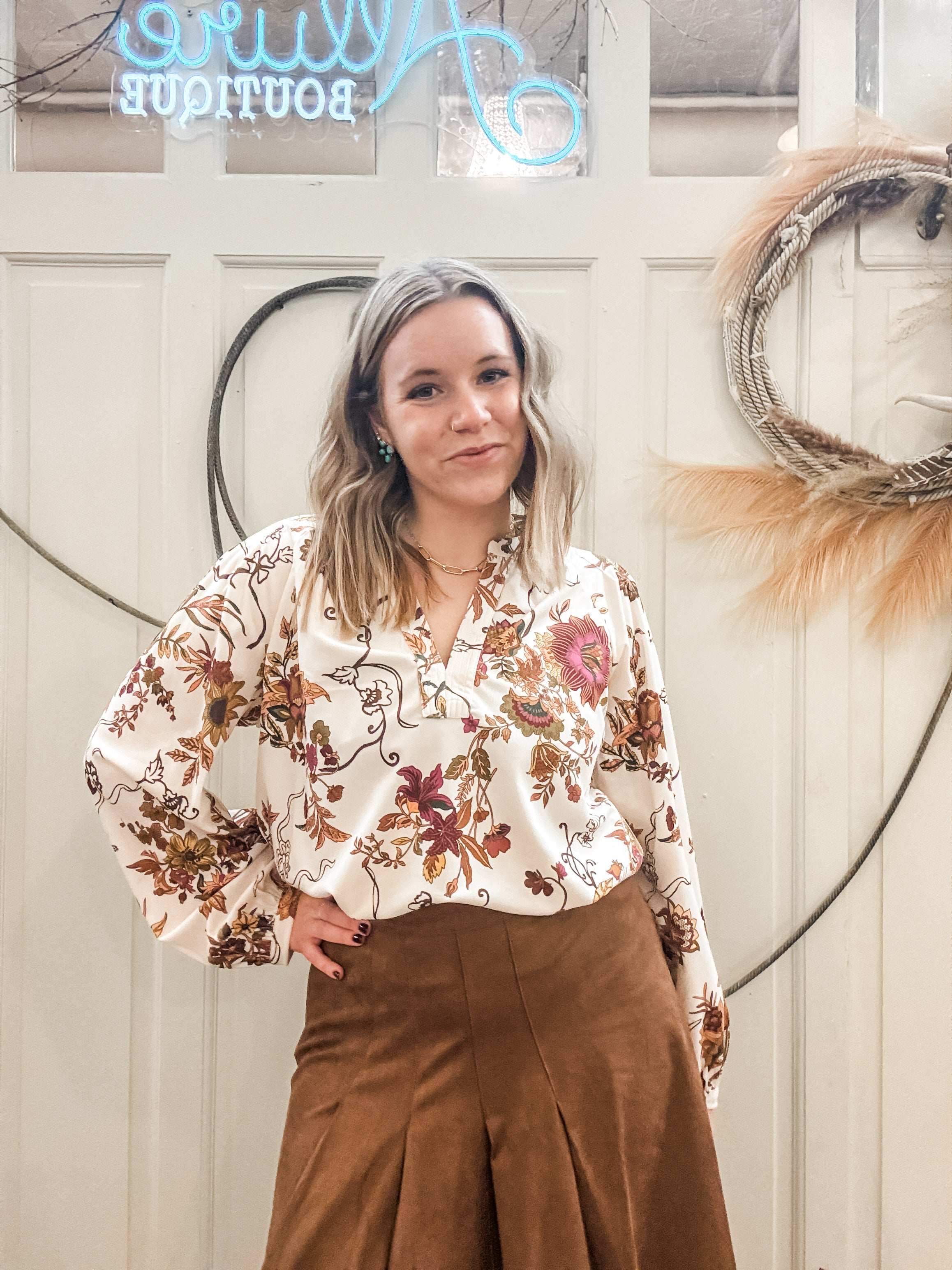 Looking for an easy way to add color and charm to your wardrobe? This floral v-neck long sleeve blouse brings a touch of feminine elegance to any look. Designed in a creamy base with warm, autumn-inspired floral prints, it features a flattering split neckline and relaxed fit that pairs beautifully with jeans, skirts, or trousers. Lightweight and flowy, it’s perfect for both workdays and weekends.