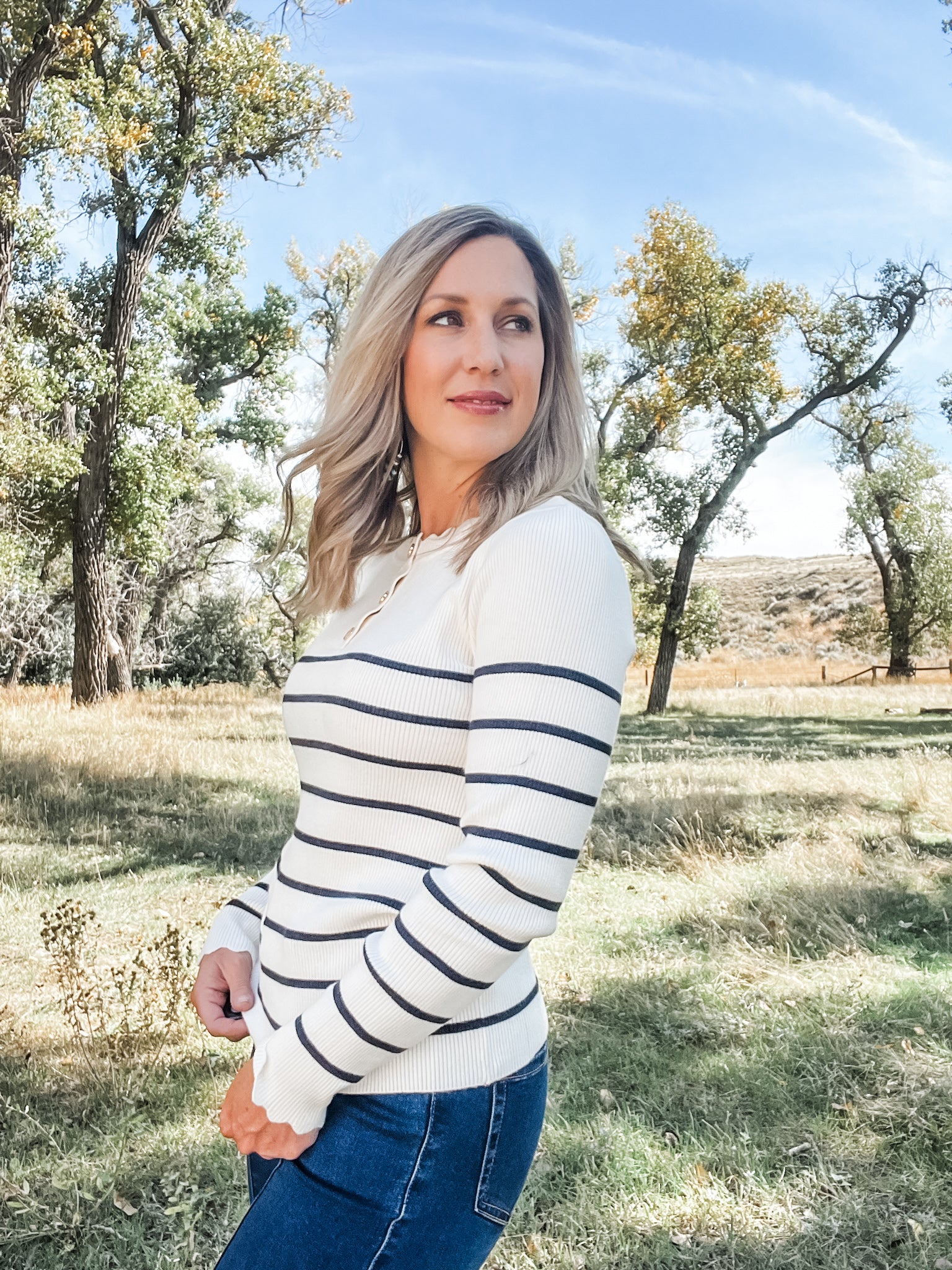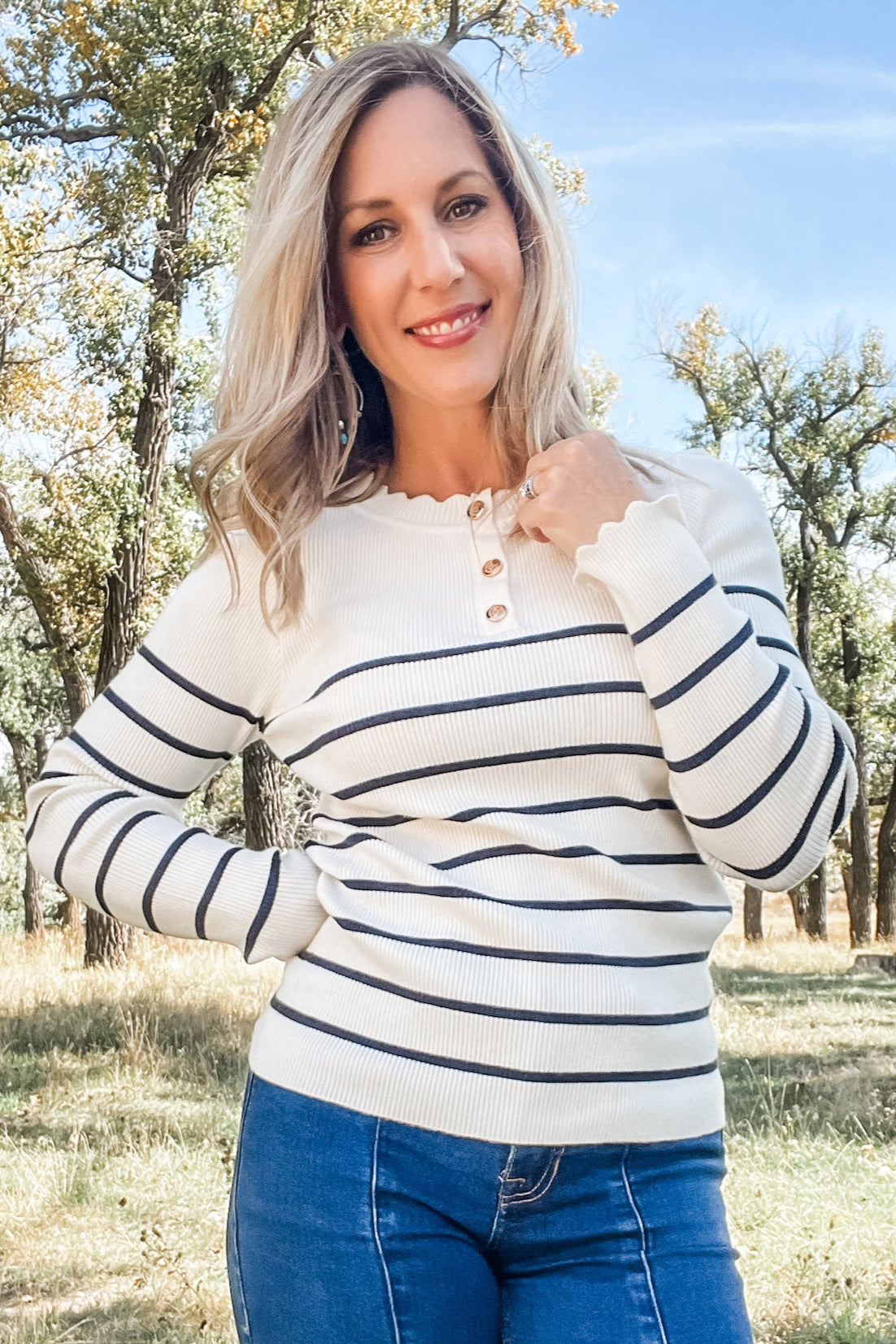 The Navy + Off White Striped Sweater from Molly Bracken is a chic everyday essential with a feminine twist. Designed with a quarter button placket featuring three gold buttons, it blends timeless stripes with delicate scalloped finishing for a polished, modern look.