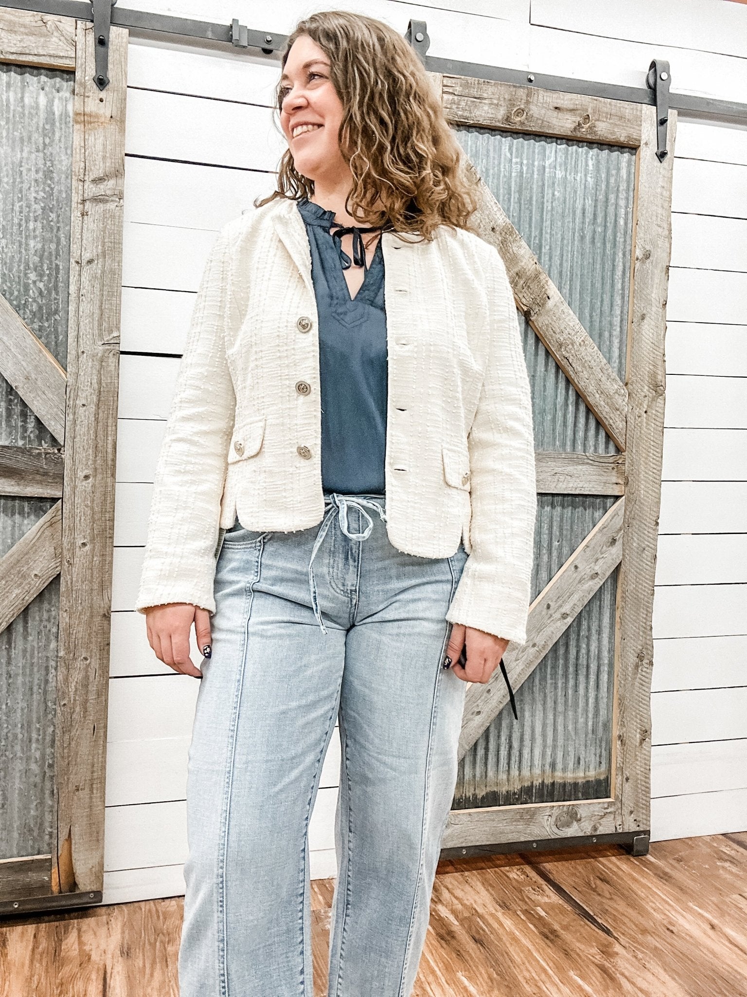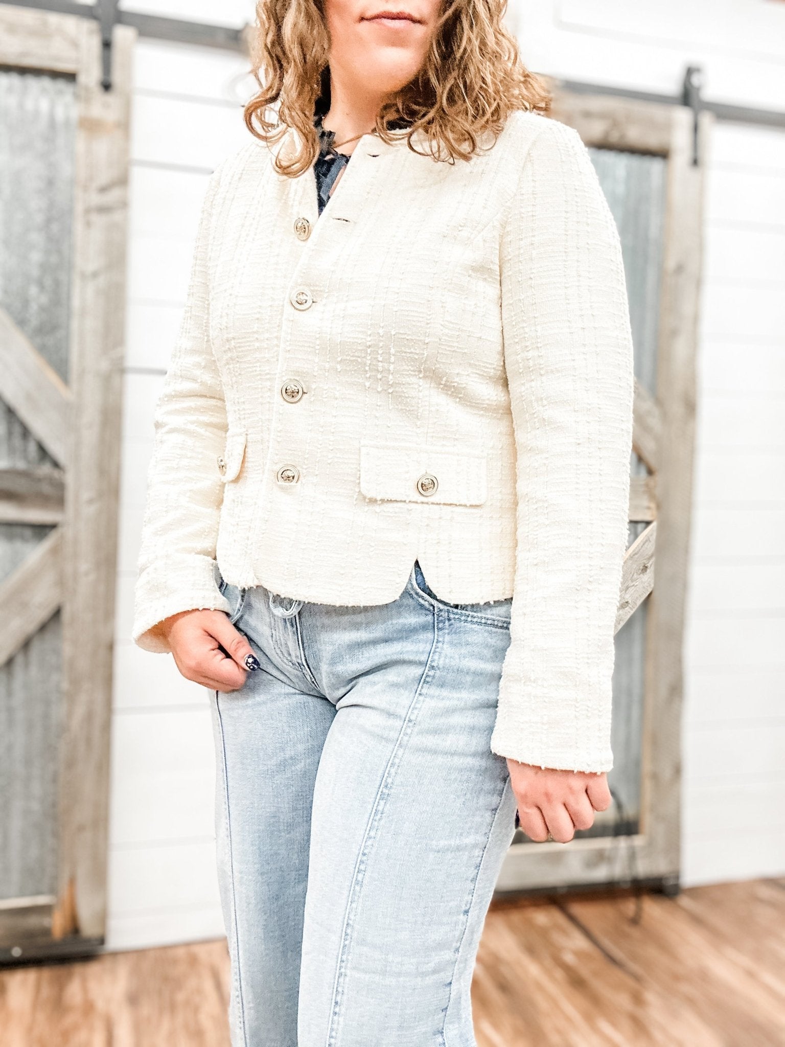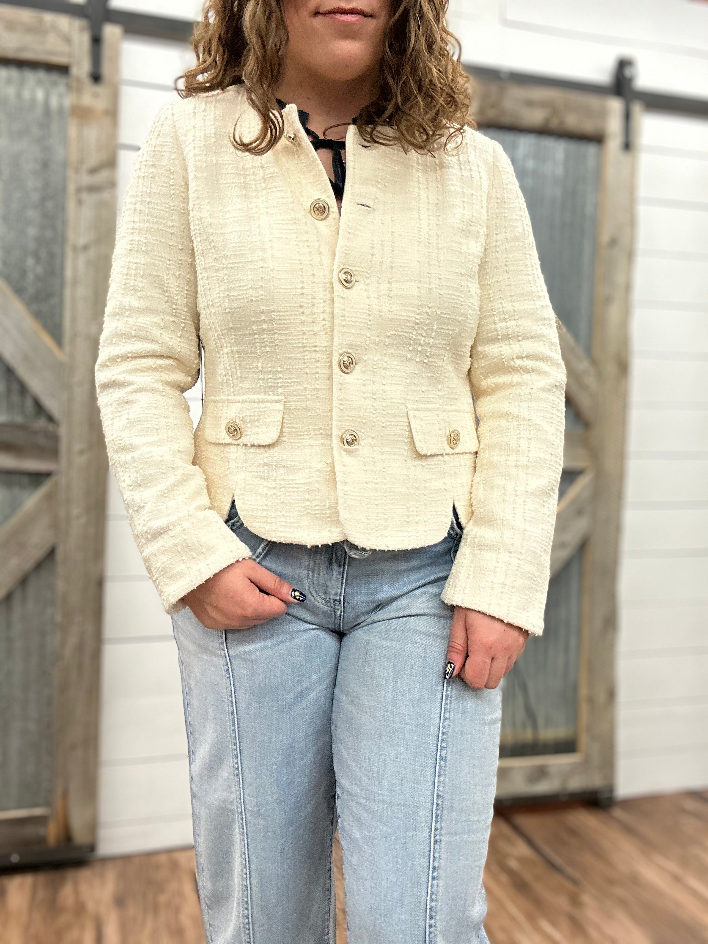 If you want a polished layer that feels feminine and refined without being bulky, this collarless jacket is the perfect choice. It adds structure to any outfit while still feeling light and easy to wear.