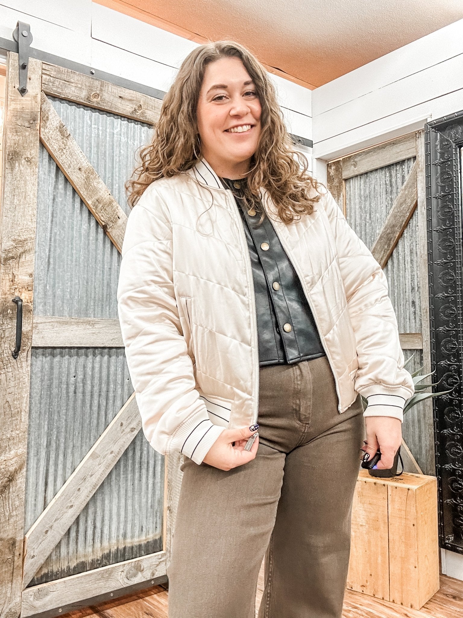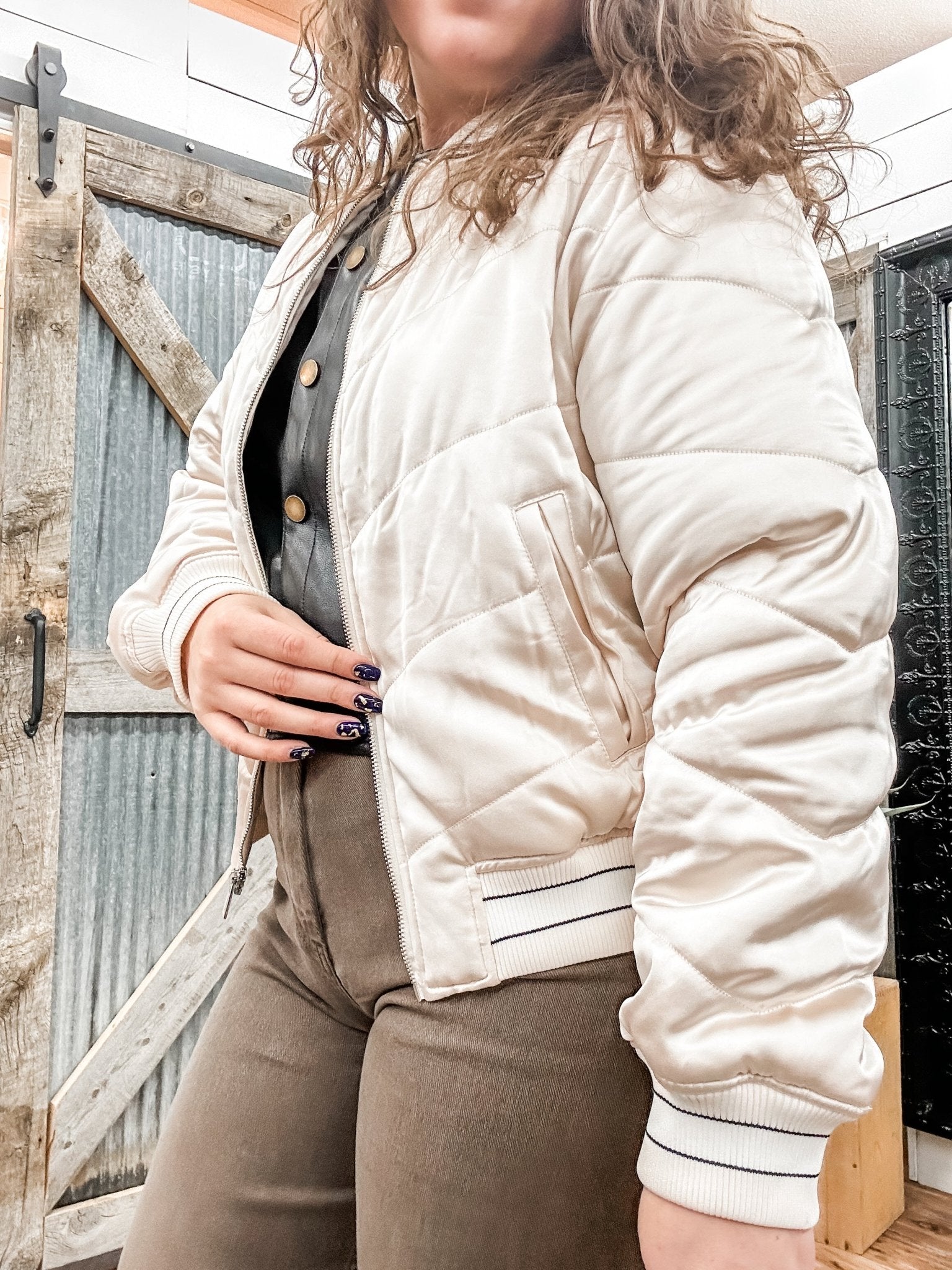 Looking for a bomber jacket that feels polished but still relaxed? The Leah Bomber delivers that effortless, cool-girl vibe with a satin finish and subtle puffed quilting. It’s lightweight yet structured, making it an easy layering piece that instantly elevates casual outfits.