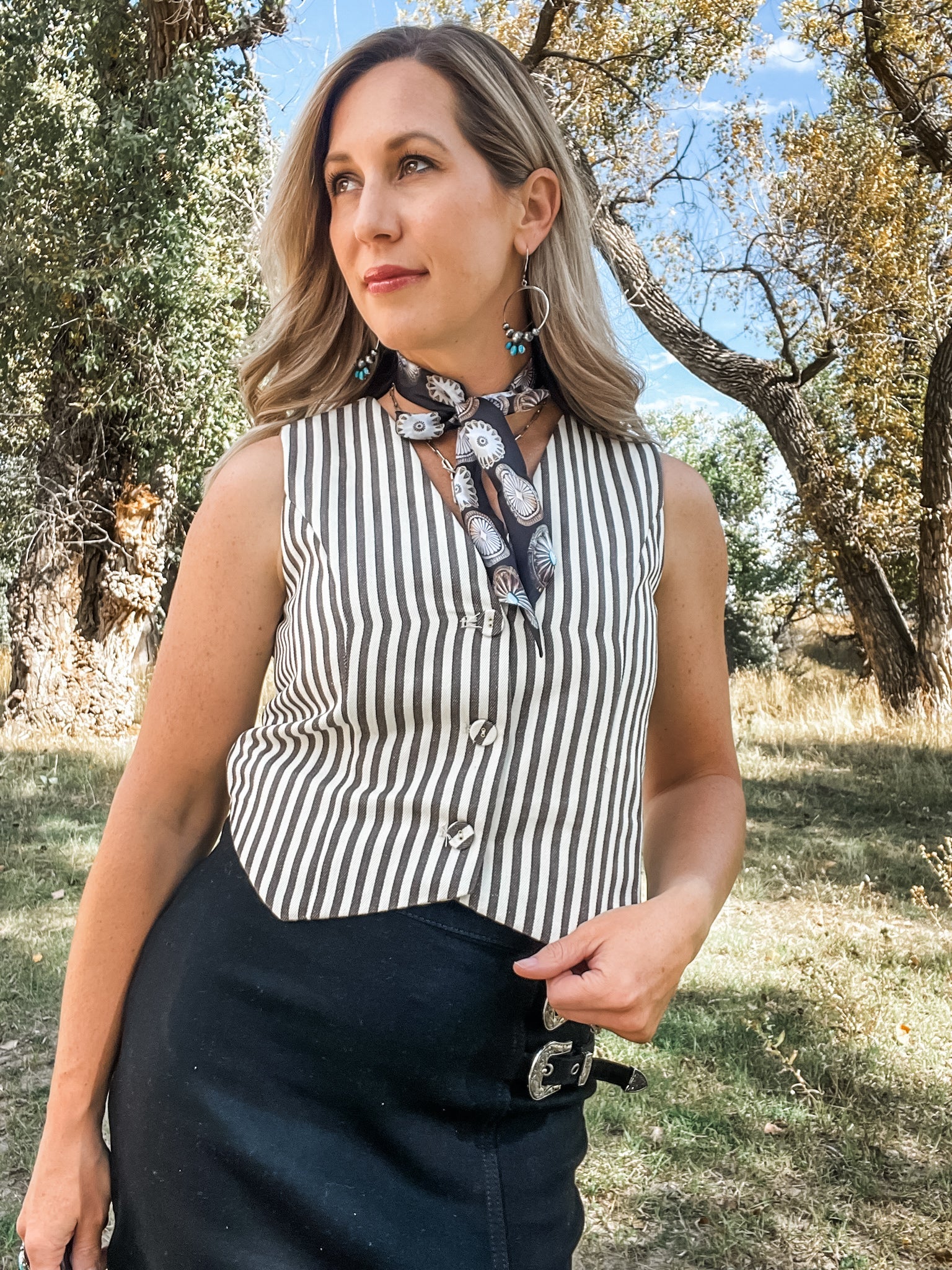 Elevate your wardrobe with this Striped Button Front Vest, a timeless layering piece that blends sophistication with everyday ease. Crafted from soft cotton, it features a refined charcoal stripe pattern that adds depth and texture to any look.