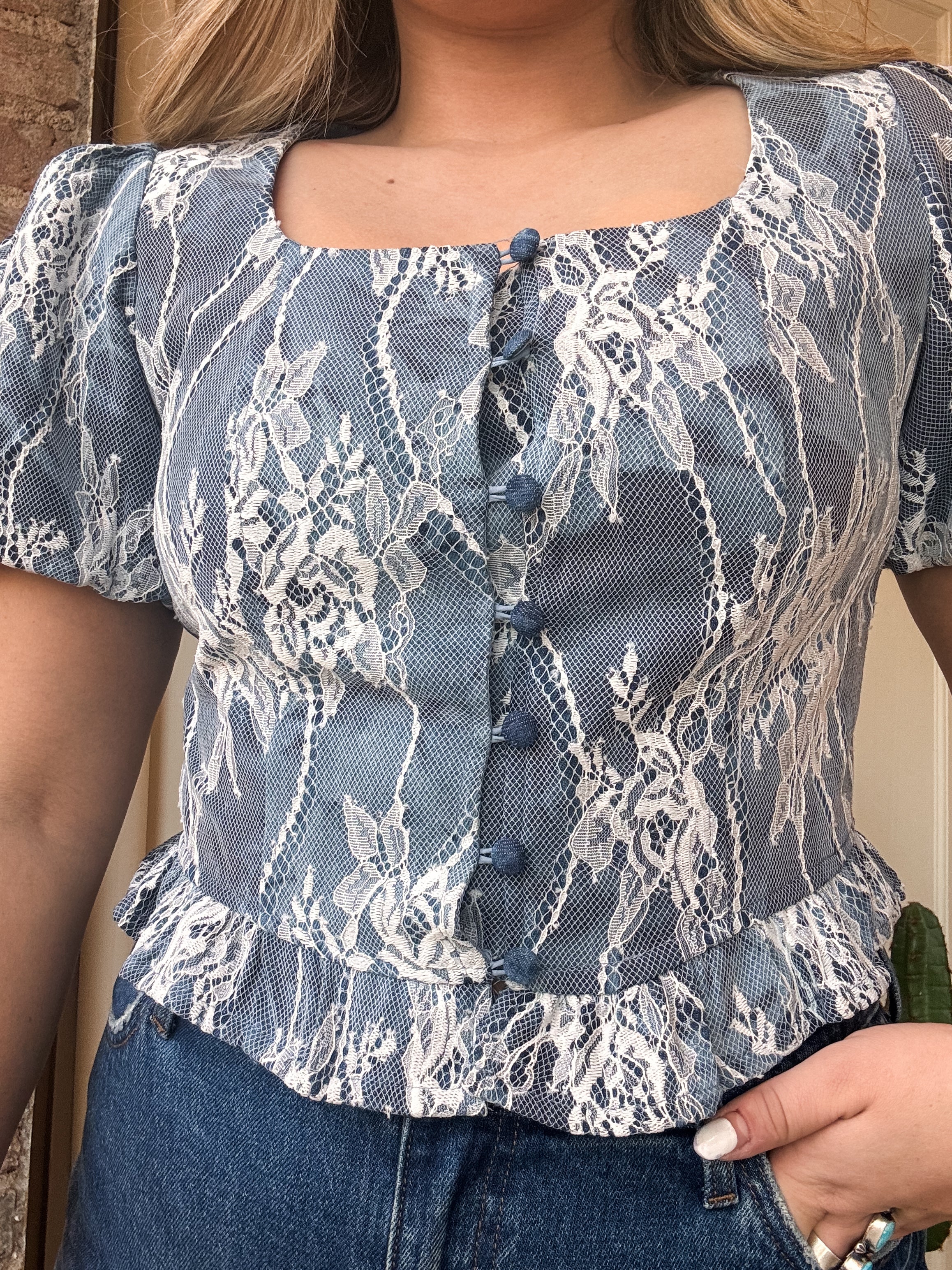 It works because of the contrast—delicate lace layered over denim, finished with a peplum hem that defines your waist and adds a little movement. The button-front detail brings in a vintage-inspired touch that makes it feel extra special.