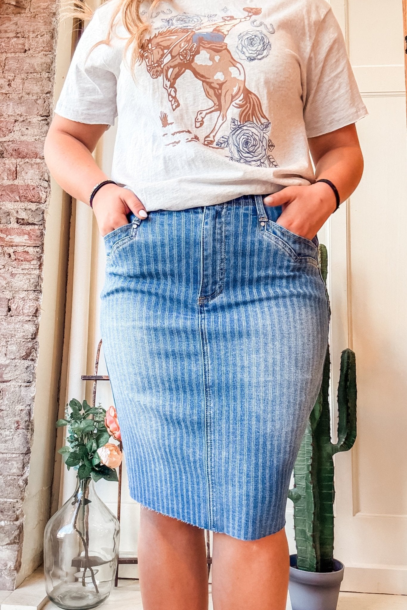 Risen Railroad Stripe Denim Pencil Skirt – High Rise Stripe Skirt