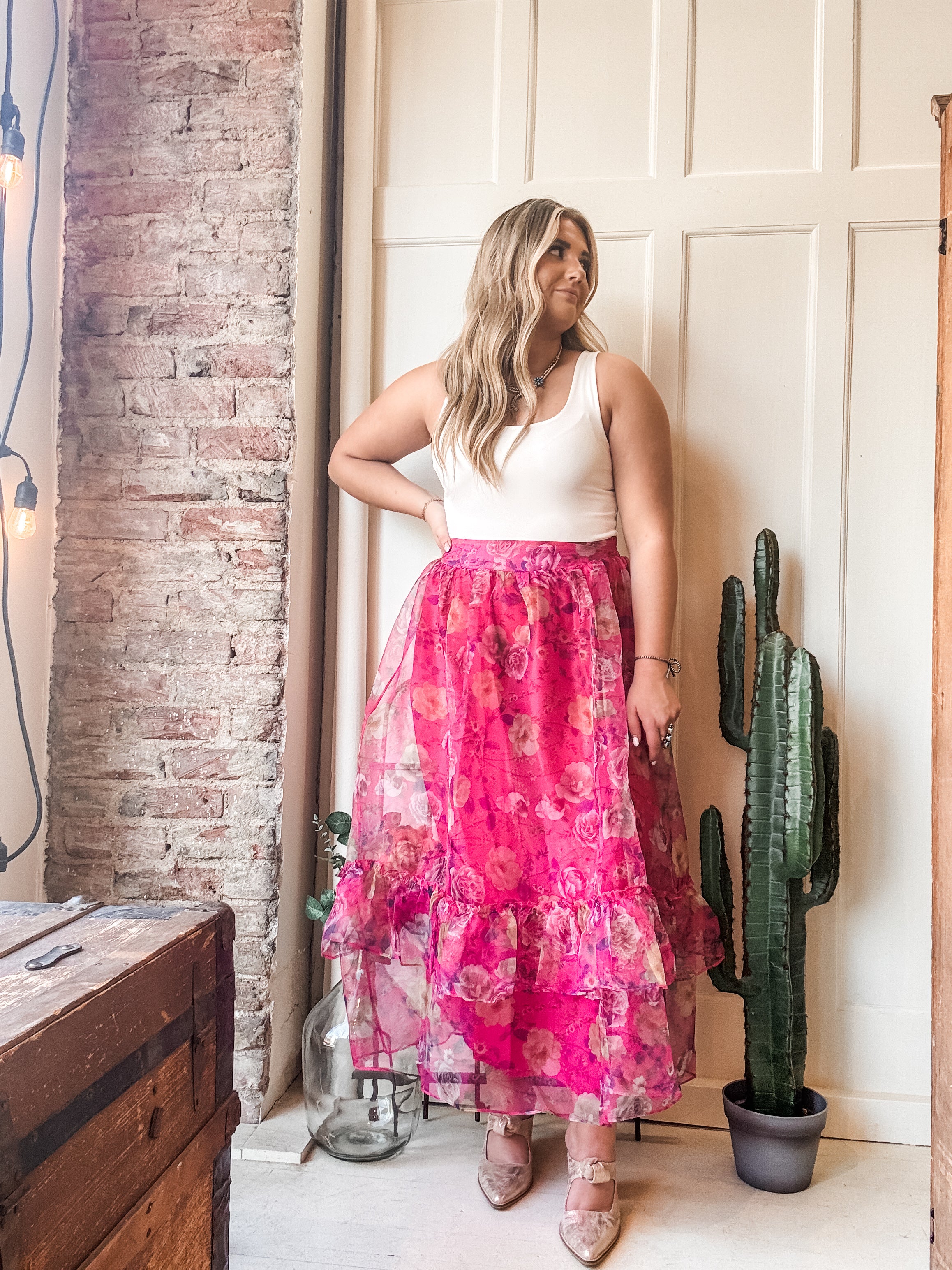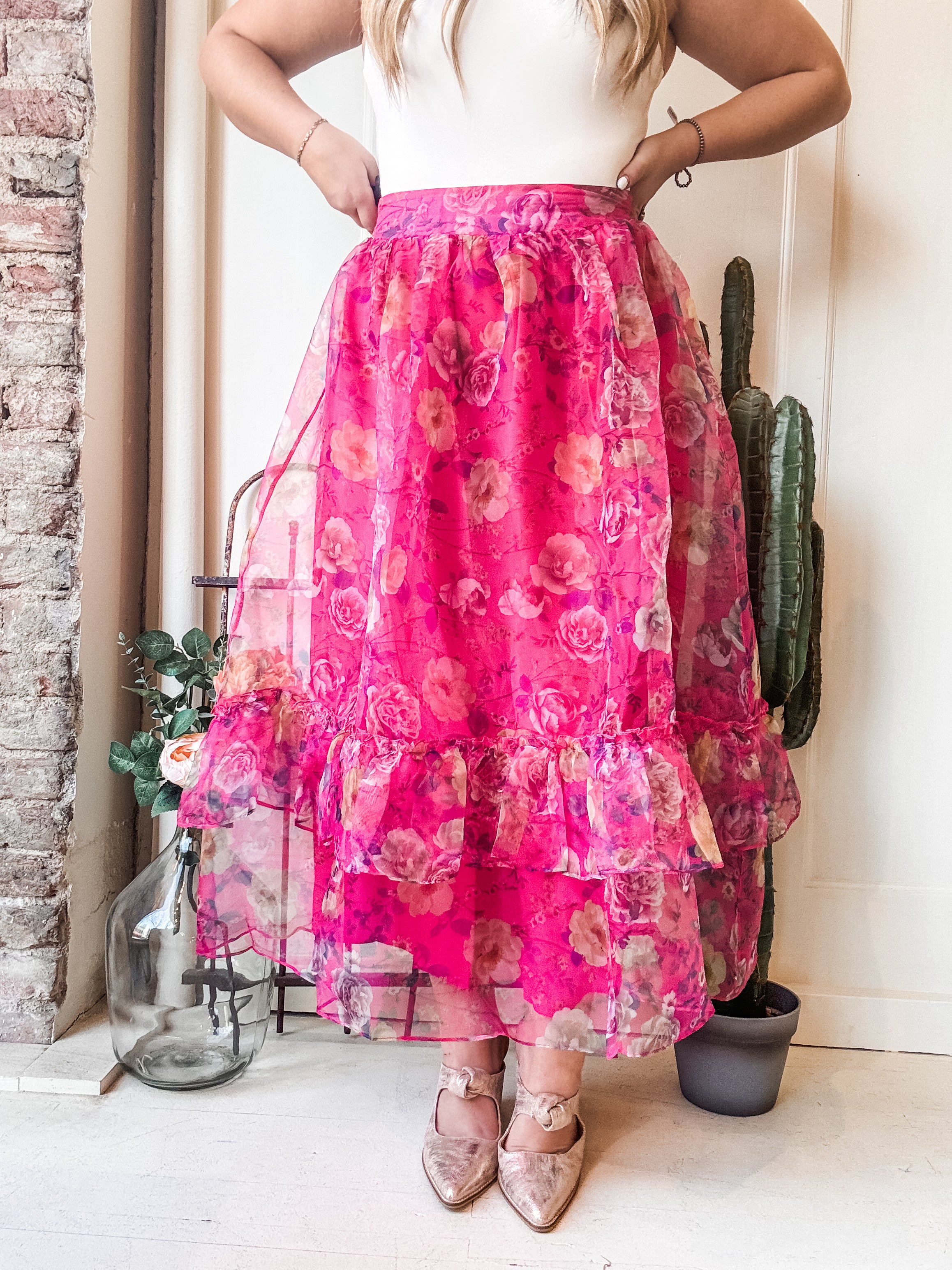 Ruffled Floral Organza Maxi Skirt – Tiered Flowy Skirt