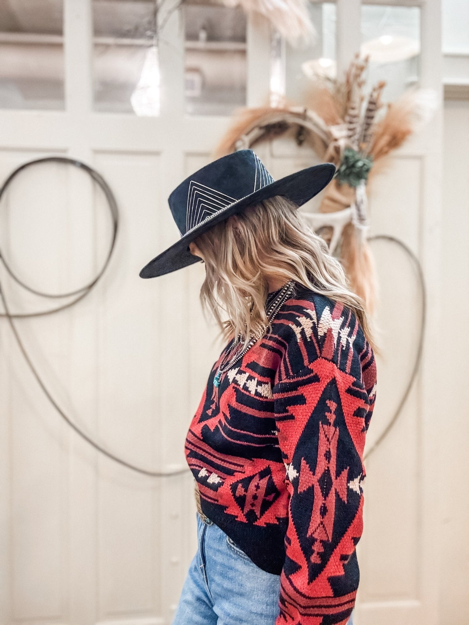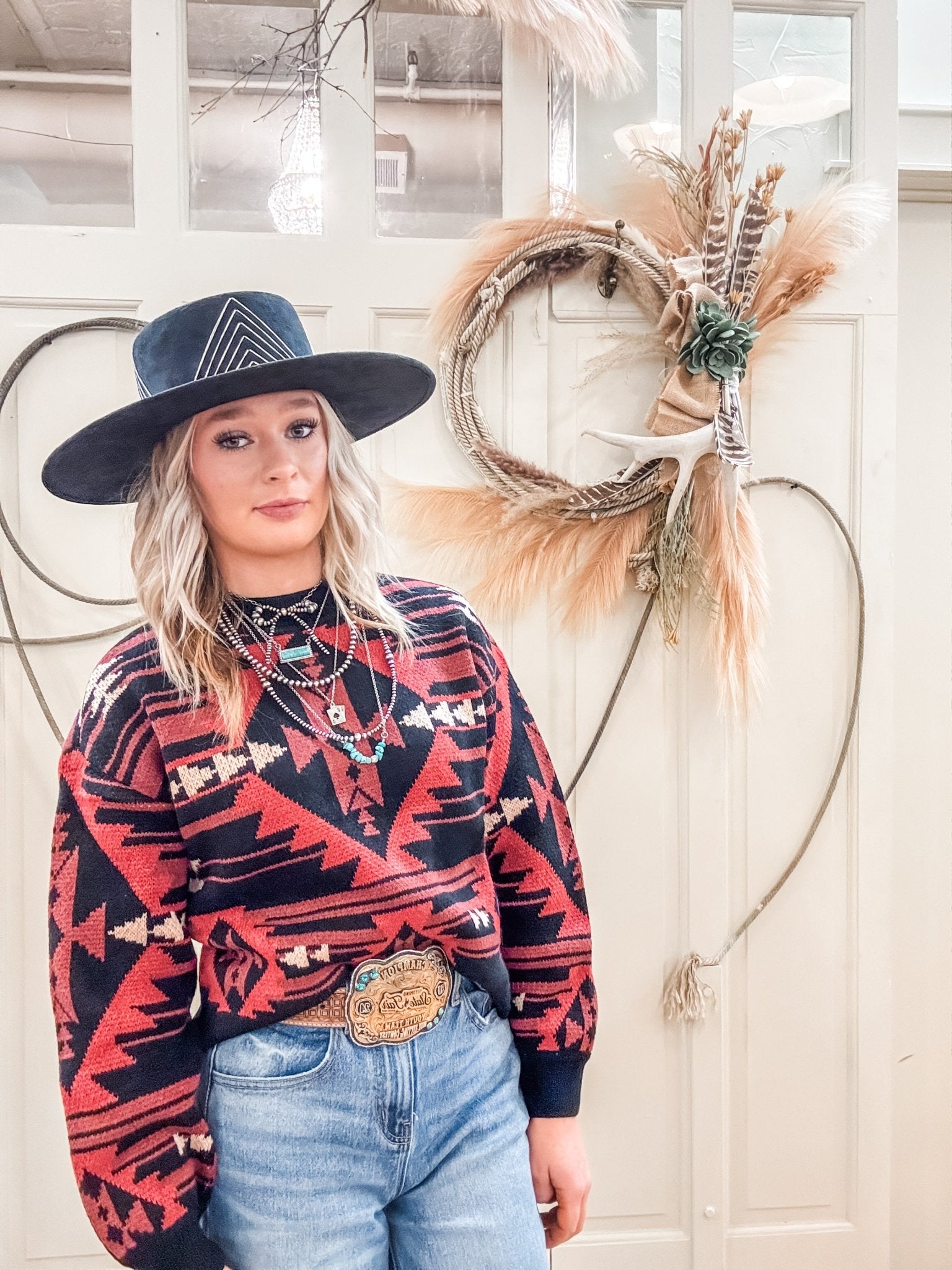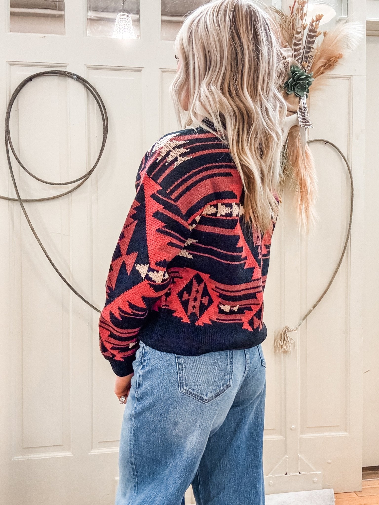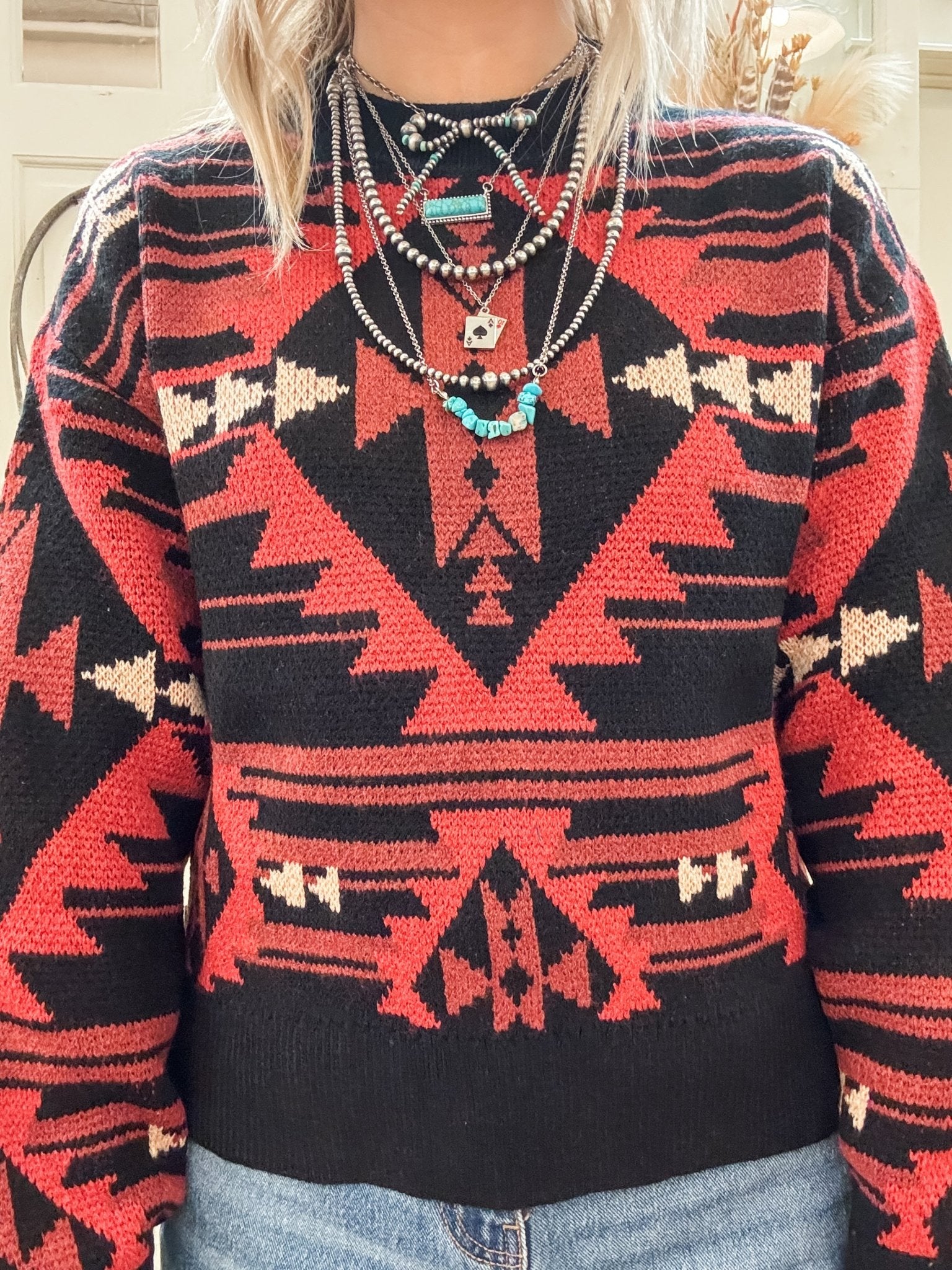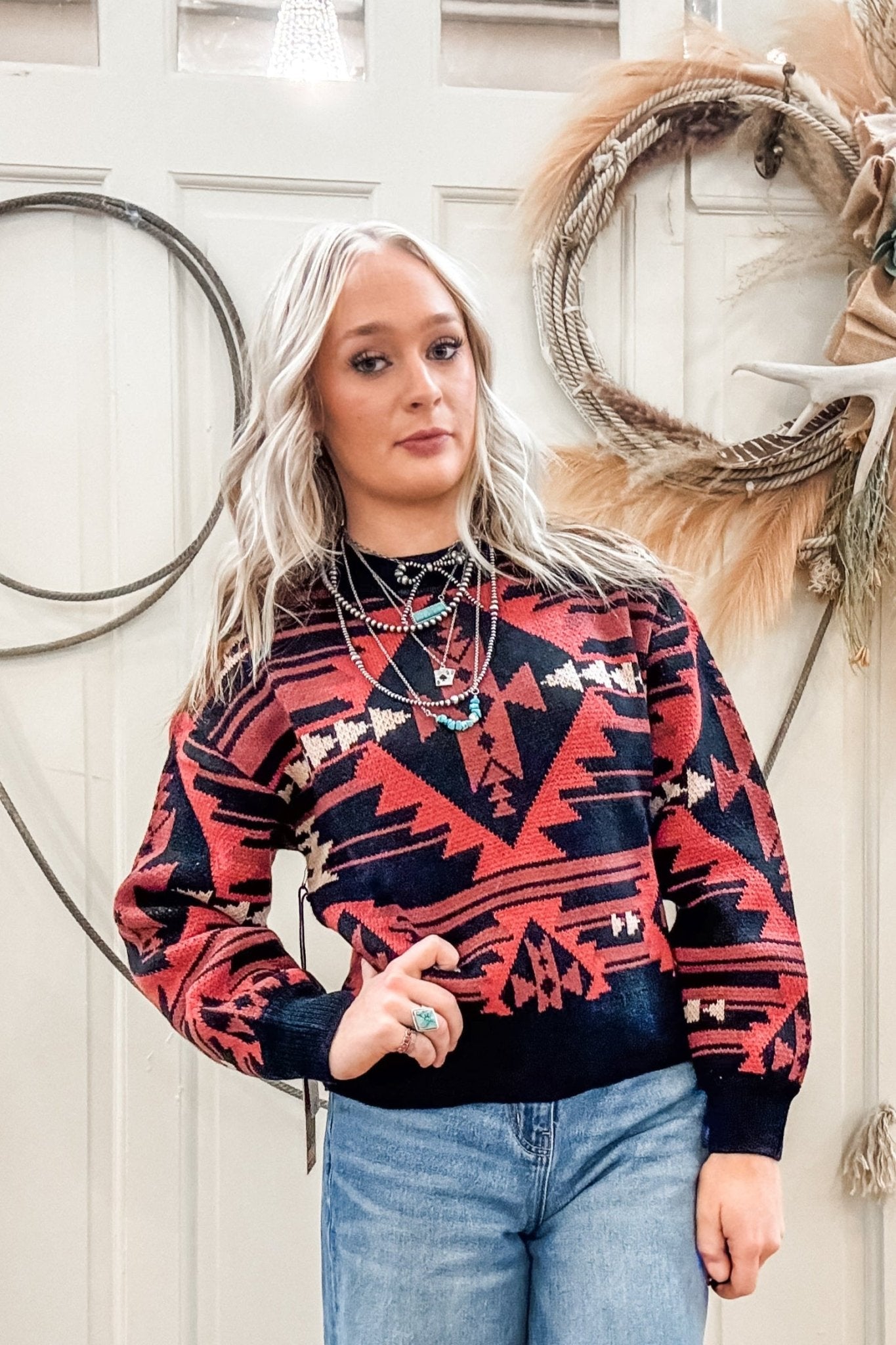 Make a bold statement with the Black Aztec Knit Sweater from Rock & Roll Denim. Featuring a striking red and black Aztec-inspired pattern, this cozy sweater blends Western edge with everyday comfort. Its relaxed knit construction offers warmth and breathability, making it an effortless go-to for cooler days.