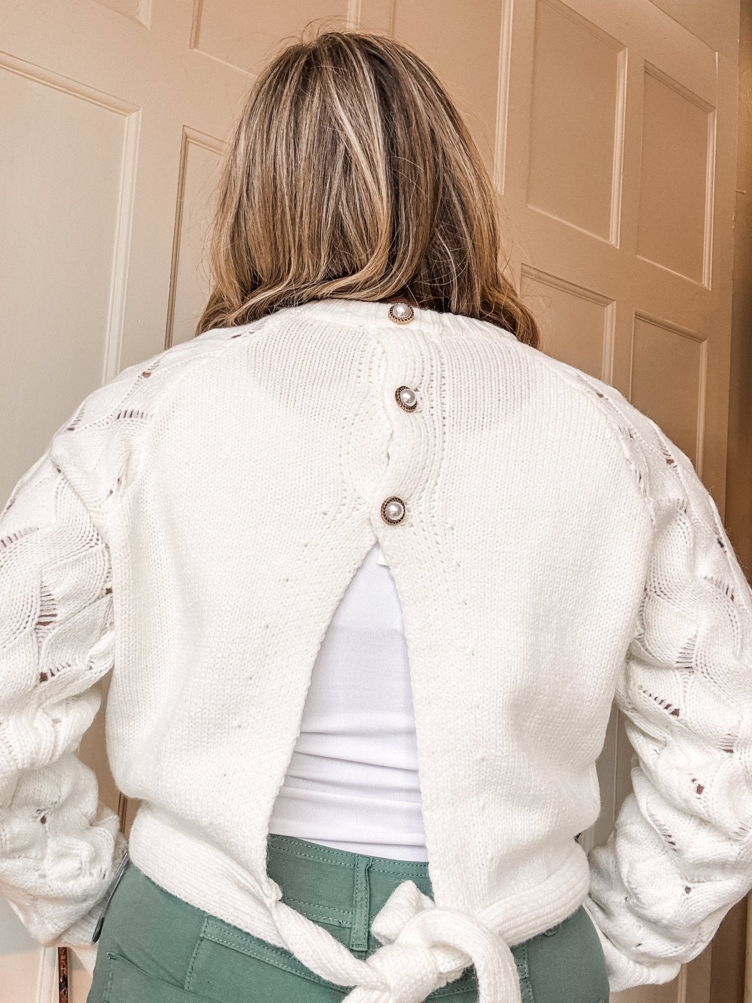 - The relaxed cropped fit makes it easy to style with high-waisted jeans or trousers, while the open-knit cable texture adds beautiful detail and dimension. The open back is the standout feature, finished with pearl-accented button closures and a self-tie waist so you can adjust the fit and add shape. It’s equal parts soft, feminine, and statement-making.