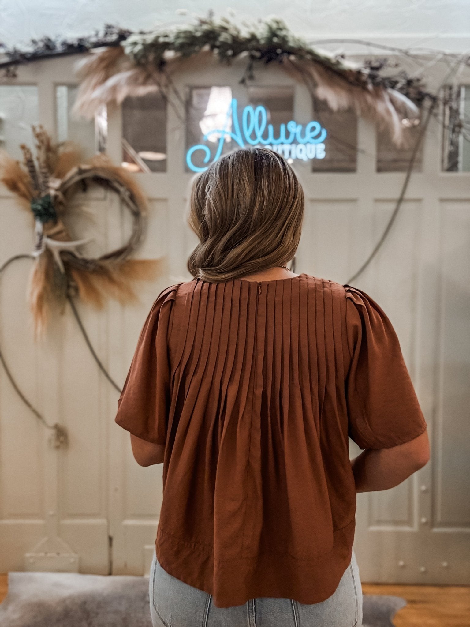 Pintuck Detail Short Sleeve Blouse – Rust
