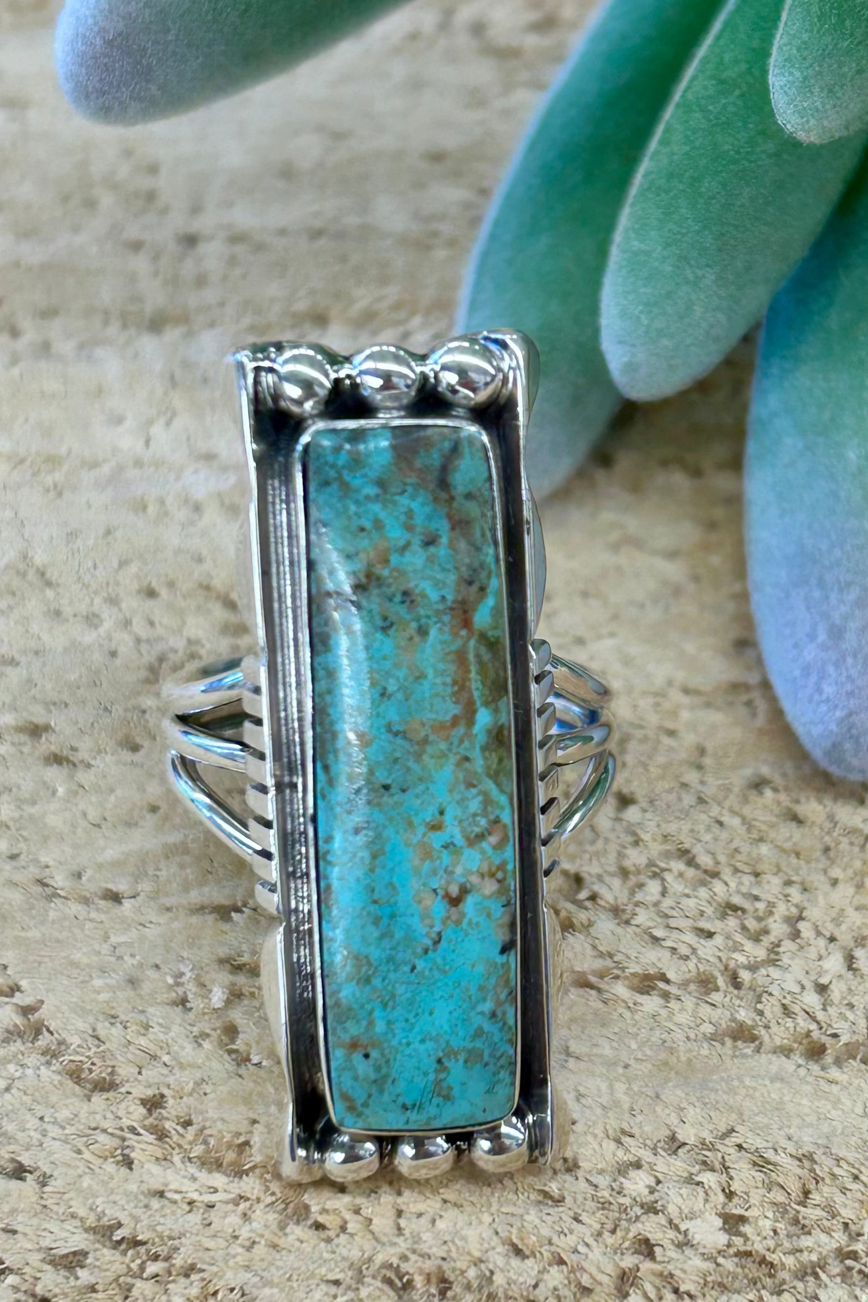 Make a statement with the Green Kingman Bar Ring, crafted from authentic Kingman turquoise and set in solid sterling silver. The striking rectangular stone showcases the natural beauty and variation of genuine turquoise, giving each ring a one-of-a-kind appeal. Sized perfectly at 9, this piece blends bold design with timeless Southwestern craftsmanship.