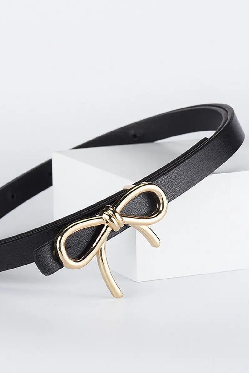 This black skinny belt is the perfect finishing accessory when you want a subtle, polished accent. The gold bow buckle brings a soft, feminine detail that elevates dresses, trousers, or oversized sweaters without adding bulk.