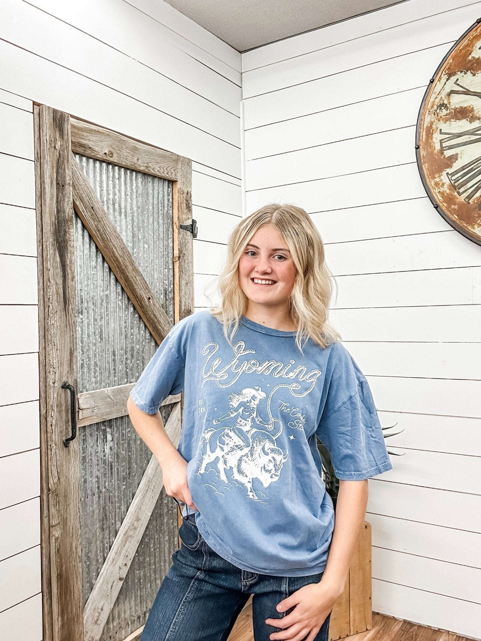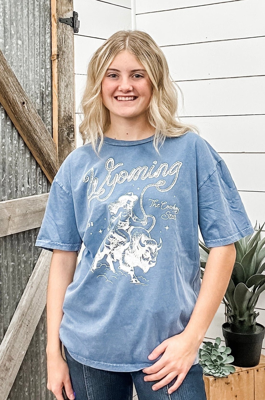 Show off your western spirit with the Cowgirl Buffalo Graphic Tee! Featuring a bold buffalo design with cowgirl flair, this indigo tee is soft, comfortable, and ready for everyday wear. Made from pre-shrunk fabric to maintain its fit wash after wash.