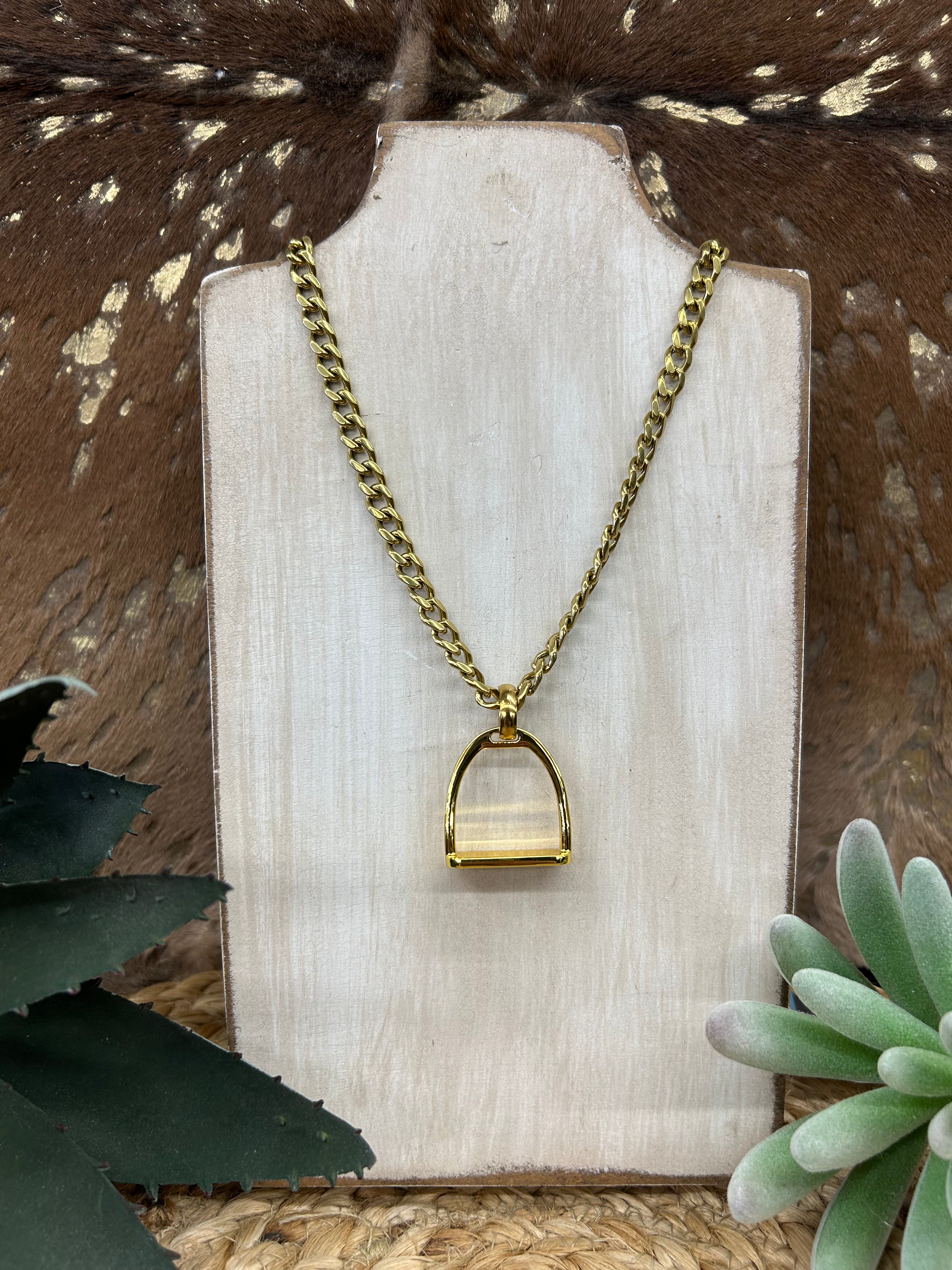 This bold gold stirrup necklace is the perfect mix of ranch-inspired charm and modern polish. Featuring a chunky gold-tone chain and a sleek stirrup pendant, it’s a statement piece that feels strong, feminine, and timeless all at once.