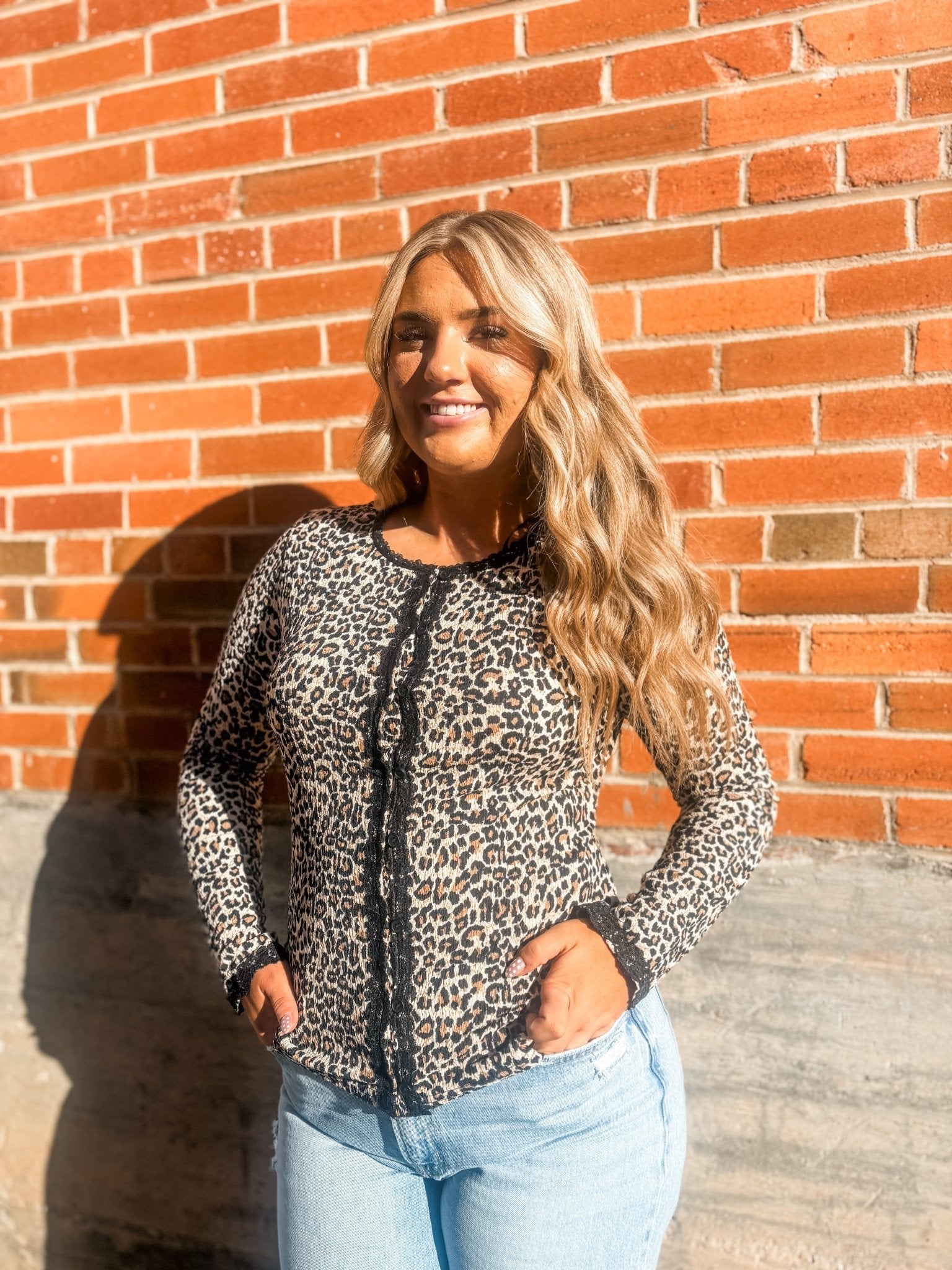 Searching for a fitted knit top that blends bold leopard print with feminine lace details?