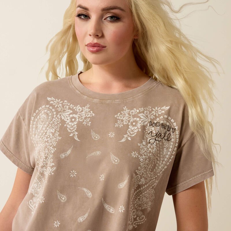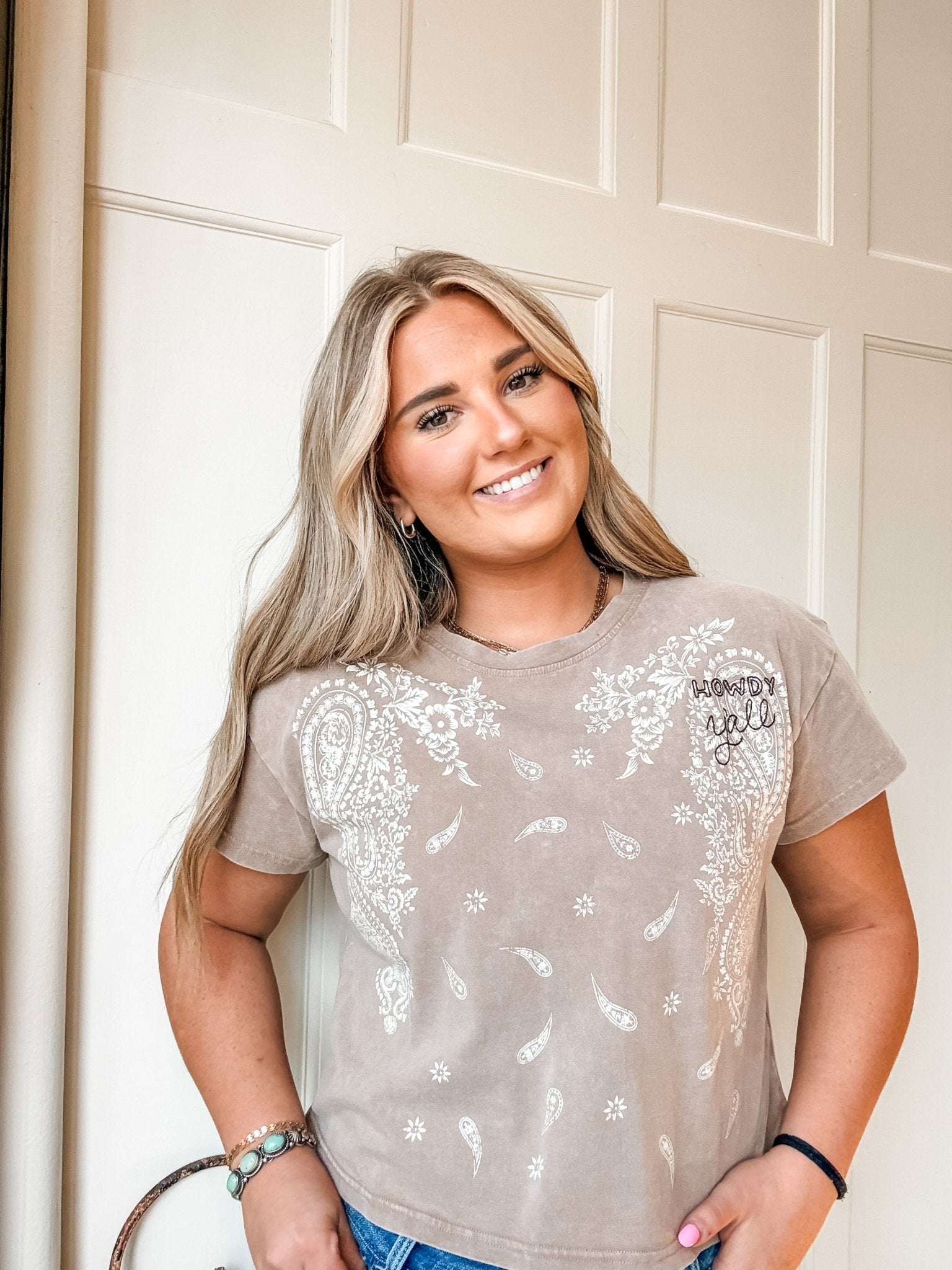 Featuring a screen-printed paisley graphic with subtle embroidery that reads “howdy y’all,” this tee blends playful western charm with everyday comfort. It’s soft, breathable, and effortless to style — just add your favorite high-waisted jeans and boots.