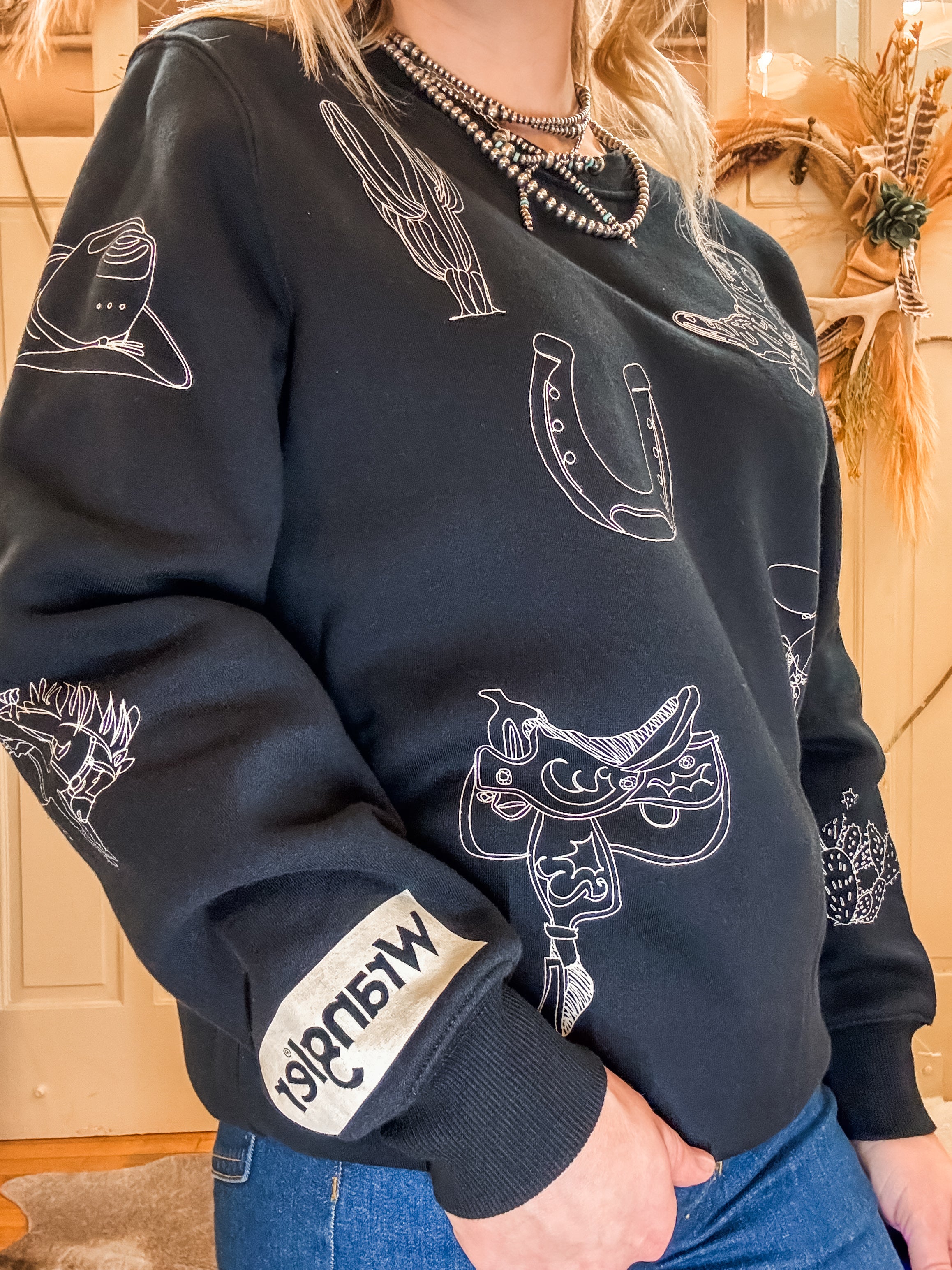 Bring classic western style to your wardrobe with the Western Print Crew Neck Sweatshirt. Crafted from a soft cotton-poly blend, this sweatshirt features a bold conversational western print and a Wrangler logo on the left cuff. Designed with long sleeves, ribbed crew neck, cuffs, and hem, it combines comfort and style for everyday wear.